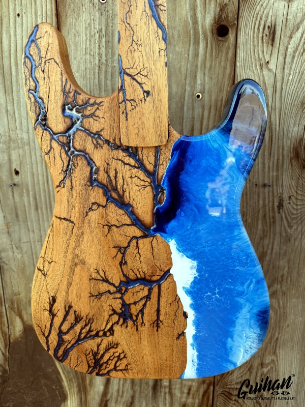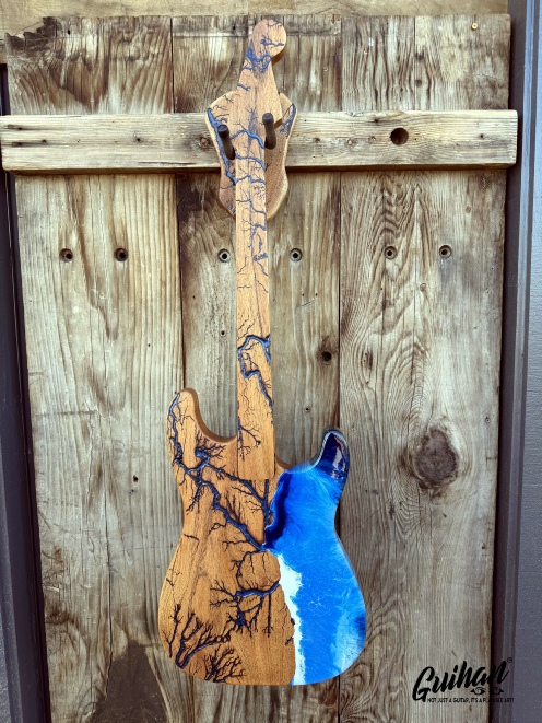 ►WOOD: The natural edges, wavy grain lines, quilting, unique colors, knots and bark inclusions are the characteristics that define live edge wood. Each wood slab has specific feature and will vary from log to log milled. Each live edge desert hardwood is uniquely hand-crafted and custom designed from weathered-down trees around metropolitan Phoenix areas. By acquiring these logs, it allows me to create 100% sustainable, re-purposed live edge wood art designs. Handmade in North Peoria, Arizona. ►Note* Since the fractal art is uniquely done to each wood, the picture shown above is not the exact fractal design you'll receive. The guitar shape and size will be the same. ►GUITAR BODY and NECK: The body and neck are cut to full size specifications and glued together. All materials were cut with bandsaw and sanded with a hand sander tools. No CNC machine used to create this art. ►FRACTAL ART: A process of applying 20,000 volts of electricity to the wood surface recreating a lightning strike in slow motion as well as unique abstract figures, tree and vein like shapes. ►OCEAN BEACH RESIN ART: Ocean beach resin art is a form of fluid art that uses epoxy resin to create a mesmerizing depiction of the ocean, often featuring waves, beaches, and sea elements, resulting in unique and captivating pieces. ►PROCESS: I use a variety of techniques, including pouring, layering, and blending resin with different colors and textures to create the illusion of waves, sea foam, and the shoreline. ►EPOXY COLORS: ANGEL WHITE, AQUA MARINE, ARIZONA GOLD, ARMY GREEN, BLACK, CARDINAL METALLIC, CARIBBEAN BLUE, DESERT COPPER, EMERALD METALLIC, GOLDEN YELLOW, GRAY METALLIC, HOT PINK, HUNTER GREEN, ORANGE, PEARL WHITE, PURPLE METALLIC, RED, SKY BLUE, TEAL METALLIC, TURQUOISE BLUE ►OIL FINISH: Hand rubbed finish using OLD MASTERS gel polyurethane clear satin oil. It brings out the natural beauty of wooden surfaces; durable coating for use on wood surfaces and contains ultraviolet absorbers for advanced sun protection. ►ABOUT THE ARTIST: Garie Chavez [Artist & Musician] – I have been designing live edge wood art since 2015. Patience, persistence, passion and attention to detail are the key ingredients to my work. My goal is for my clients to have a piece of art that they cherish, and know that it is truly one of a kind and made especially for them. Thank you for having my art in your home. ►COMPLETION TIMELINE: Please allow 1-2 weeks to complete from the time order is received.
