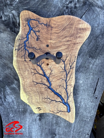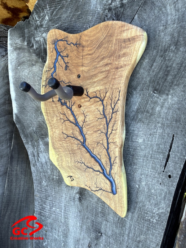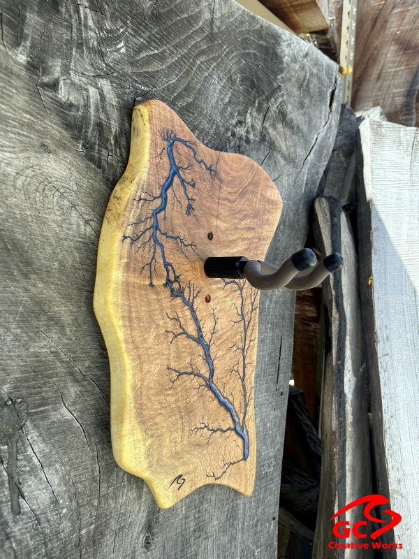 ►DESIGN: This is an inspired guitar hanger custom hand-crafted features a fractal art design. This creative art is a tribute to a person who has been a profound influence on my musical life since childhood. It stands as a symbol of my gratitude for his immense talent and lasting impact on the world of music. ►DISCLAIMER: GC Creative Works/Guihan Guitars is not affiliated with, or endorsed, sponsored, or supported by any professional musician artists. The name and picture are merely for descriptive purposes only. The guitar in the picture is not included. It is solely used for descriptive visual purposes only. ►WOOD: Arizona grown desert hardwood is uniquely hand-crafted and custom designed from weathered-down trees found in metropolitan Phoenix areas. By recovering the logs, allows me to create a 100% sustainable guitar hanger. Note* Since the fractal art is uniquely done to each wood, the picture shown above is not the exact fractal design you'll receive. The shape and size will be the same. ►FRACTAL ART: A process of applying 20,000 volts of electricity to the wood surface recreating a lightning strike in slow motion as well as unique abstract figures, tree and vein like shapes. It is sealed with epoxy inlay ink self-leveling high gloss U.V. resistant formula. ►EPOXY: Self-leveling high gloss U.V. A resistant formula epoxy with color pigment is added to seal the burns created during fractal art process on the surface of the wood. The colors available are: (Angel White, Aqua Marine, Arizona Gold, Army Green, Black, Blue Metallic, Cardinal Metallic, Caribbean Blue, Desert Copper, Emerald Metallic, Golden Yellow, Gray Metallic, Hot Pink, Hunter Green, Orange Crush, Pearl White, Purple Metallic, Red Metallic, Silver Grey, Teal Metallic, Turquoise Blue. Other colors available upon request.) ►OIL FINISH: Hand rubbed Old Masters clear satin gel polyurethane and food grade oils to bring out the natural beauty of wooden surfaces. ►STRING SWING HARDWARE: The new design, known as the “Guitar Keeper”, has a deep cradle design that prevents the guitar from being improperly placed into the hanger. This ultimately provides a safer hanger for your instrument, as the guitar needs to be lifted 2 inches and brought forward to be removed. The pivoting yoke allows for Electric, Acoustic or Bass guitar headstocks to be cradled perfectly while still hanging straight. Made in the USA. ►DESIGN ENGINEERING: Garie Chavez has researched and tested the use of proper hardware for mounting the String Swing guitar hanger to live edge wood materials. A threaded insert made of carbon steel zinc plated finish goes into a pre pre-drilled hole and has internal threads. It offers a strong permanent thread to live edge hardwood and mount the guitar hanger yoke. Mounting hardware included with two drywall anchors and two 2-inch Phillips wood screws. ►MOUNTING INSTRUCTIONS: To mount on existing stud walls, drive the screws through pre-drilled pilot holes of the hanger into the wall using a Phillips screwdriver. If a wall stud is not found, mark the pilot holes on the guitar hanger using a Phillips screwdriver to push and turn the aluminum wall anchor clockwise until flush. Mount the guitar hanger with screws provided through the pilot holes and secure into drywall anchors. GC Creative Works is not responsible for any damages to the musical instrument for any improper installation of the guitar hanger to the wall.It is the sole responsibility of the owner/buyer to properly install the guitar hanger to the wall. ►DONATION: GC Creative Works donate part of the sales of guitar hanger fractal art to Sweet Relief Musicians Fund. A 501-C3 non profit charity that provides services and financial assistance for all types of career musicians and music industry professionals. Thank you for your support. ►PAYMENT TERMS: PAYPAL secure shopping cart is used on this website for online purchases. ►DIMENSIONS: Height: 15-16 inches Width: 8-10 inches Thickness: 1-1-1/4 inch ►SHIPPING TERMS: Free to continental US states including Alaska, Hawaii and Puerto Rico. Standard Shipping takes 3 to 7 business days from the date of order received. Additional freight charges for International shipments. ►COMPLETION TIME: Please allow 3-7 days to complete from the time order is received.