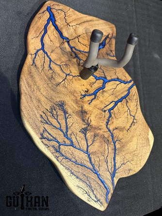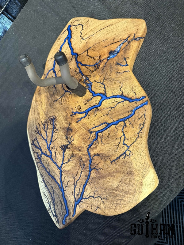►INSPIRATION: The creative design behind each guitar hanger is based on the musicians I’ve come to admire throughout my lifetime that made an impact and inspired me to play guitar. It’s my token of appreciation for creating great music of my generation. Keep ROCKING the world! ►DISCLAIMER: GC Creative Works is not affiliated with, or endorsed, sponsored, or supported by any professional musician artists. The names and images are merely for descriptive purposes only. ►DONATION: GC Creative Works donate part of the guitar hanger sale to MusiCares. A non-profit organization that helps the humans behind music because music gives so much to the world. Thank you for your support. ►LIVEEDGEWOOD: Each live edge guitar hanger is uniquely hand-crafted and custom designed from weathered-down trees found around metropolitan Phoenix, Arizona. By acquiring these logs, it allows me to create 100% sustainable, re-purposed live edge wood art designs. Locally source and made in North Peoria, Arizona. ►FRACTALART: A process of applying 20,000 volts of electricity to the wood surface recreating a lightning strike in slow motion as well as unique abstract figures, tree and vein like shapes. It is sealed with epoxy inlay ink self-leveling high gloss U.V. resistant formula. ►EPOXYCOLORS: Angel White, Aqua Marine, Arizona Gold, Army Green, Black, Blue Metallic, Cardinal Metallic, Caribbean Blue, Desert Copper, Emerald Metallic, Golden Yellow, Gray Metallic, Hot Pink, Hunter Green, Neon Green, Orange Crush, Pearl White, Purple Metallic, Red Metallic, Silver Grey, Teal Metallic, Turquoise Blue. Other colors available upon request. ►OILFINISH: Hand rubbed Old Masters clear satin gel polyurethane and food grade oils to bring out the natural beauty of wooden surfaces. ►GUITARHARDWARE: The new design, known as the “Guitar Keeper”, has a deep cradle design that prevents the guitar from being improperly placed into the hanger. This ultimately provides a safer hanger for your instrument, as the guitar needs to be lifted 2 inches and brought forward to be removed. The pivoting yoke allows for Electric, Acoustic or Bass guitar headstocks to be cradled perfectly while still hanging straight. Made in the USA. ►ENGINEERING: GC Creative Works researched and tested the use of proper hardware for mounting the String Swing guitar hanger to live edge wood materials. A threaded insert made of carbon steel zinc plated finished goes into predrilled hole and has internal threads. It offers a strong permanent thread to live edge hardwood and mount the guitar hanger yoke. Mounting hardware included with two drywall anchors and two 2-inch Phillips wood screws. ►MOUNTING INSTRUCTIONS: To mount on existing stud walls, drive the screws through pre-drilled pilot holes of hanger into wall using a Phillips screwdriver. If a wall stud is not found, mark the pilot holes on the guitar hanger using a Phillips screwdriver to push and turn the aluminum wall anchor clockwise until flush. Mount the guitar hanger with screws provided through the pilot holes and secure into drywall anchors. GC Creative Works is not responsible for any damages to the musical instrument for any improper installation of the guitar hanger to the wall.It is the sole responsibility of the owner/buyer to properly install the guitar hanger to the wall. ►DIMENSIONS: Height: 15-16 inches Width: 8-10 inches Thickness: 1-1-1/4 inch ►COMPLETIONTIMELINE: Please allow 3-7 days to complete from the time order is received.