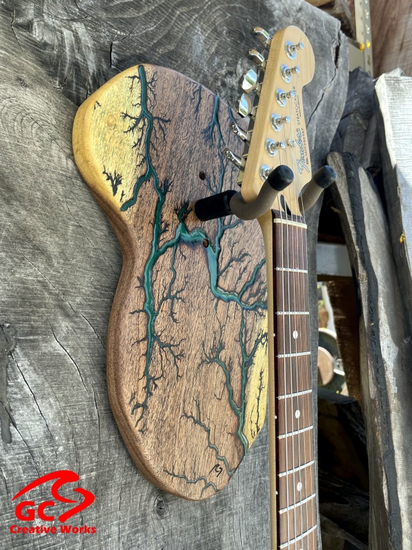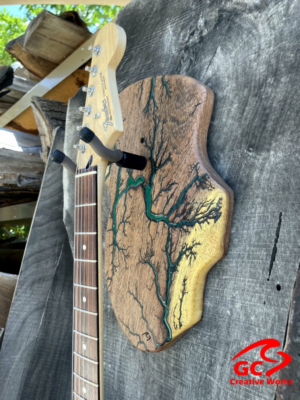 ►INSPIRATION: The creative design behind each guitar hanger is based on the musicians I’ve come to admire throughout my lifetime that made an impact and inspired me to play guitar. It’s my token of appreciation for creating great music of my generation. Keep ROCKING the world! ►DISCLAIMER: GC Creative Works is not affiliated with, or endorsed, sponsored, or supported by any professional musician artists. The names and images are merely for descriptive purposes only. ►DONATION: GC Creative Works donate part of the guitar hanger sale to MusiCares. A non-profit organization that helps the humans behind music because music gives so much to the world. Thank you for your support. ►LIVEEDGEWOOD: Each live edge guitar hanger is uniquely hand-crafted and custom designed from weathered-down trees found around metropolitan Phoenix, Arizona. By acquiring these logs, it allows me to create 100% sustainable, re-purposed live edge wood art designs. Locally source and made in North Peoria, Arizona. ►FRACTALART: A process of applying 20,000 volts of electricity to the wood surface recreating a lightning strike in slow motion as well as unique abstract figures, tree and vein like shapes. It is sealed with epoxy inlay ink self-leveling high gloss U.V. resistant formula. ►EPOXYCOLORS: Angel White, Aqua Marine, Arizona Gold, Army Green, Black, Blue Metallic, Cardinal Metallic, Caribbean Blue, Desert Copper, Emerald Metallic, Golden Yellow, Gray Metallic, Hot Pink, Hunter Green, Neon Green, Orange Crush, Pearl White, Purple Metallic, Red Metallic, Silver Grey, Teal Metallic, Turquoise Blue. Other colors available upon request. ►OILFINISH: Hand rubbed Old Masters clear satin gel polyurethane and food grade oils to bring out the natural beauty of wooden surfaces. ►GUITARHARDWARE: The new design, known as the “Guitar Keeper”, has a deep cradle design that prevents the guitar from being improperly placed into the hanger. This ultimately provides a safer hanger for your instrument, as the guitar needs to be lifted 2 inches and brought forward to be removed. The pivoting yoke allows for Electric, Acoustic or Bass guitar headstocks to be cradled perfectly while still hanging straight. Made in the USA. ►ENGINEERING: GC Creative Works researched and tested the use of proper hardware for mounting the String Swing guitar hanger to live edge wood materials. A threaded insert made of carbon steel zinc plated finished goes into predrilled hole and has internal threads. It offers a strong permanent thread to live edge hardwood and mount the guitar hanger yoke. Mounting hardware included with two drywall anchors and two 2-inch Phillips wood screws. ►MOUNTING INSTRUCTIONS: To mount on existing stud walls, drive the screws through pre-drilled pilot holes of hanger into wall using a Phillips screwdriver. If a wall stud is not found, mark the pilot holes on the guitar hanger using a Phillips screwdriver to push and turn the aluminum wall anchor clockwise until flush. Mount the guitar hanger with screws provided through the pilot holes and secure into drywall anchors. GC Creative Works is not responsible for any damages to the musical instrument for any improper installation of the guitar hanger to the wall.It is the sole responsibility of the owner/buyer to properly install the guitar hanger to the wall. ►DIMENSIONS: Height: 15-16 inches Width: 8-10 inches Thickness: 1-1-1/4 inch ►COMPLETIONTIMELINE: Please allow 3-7 days to complete from the time order is received.