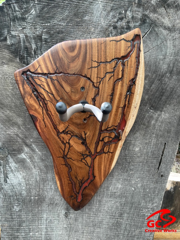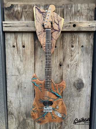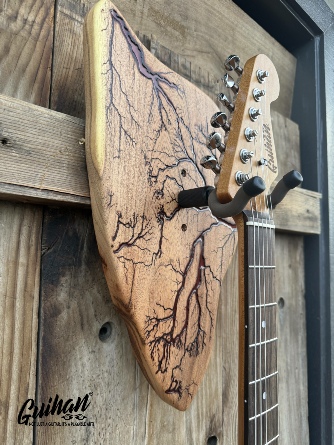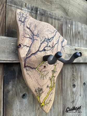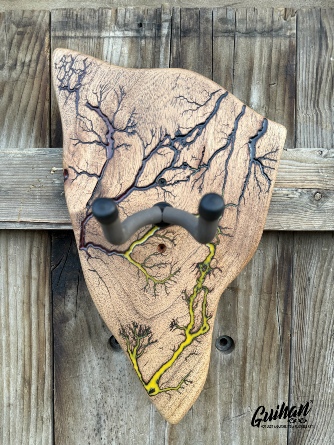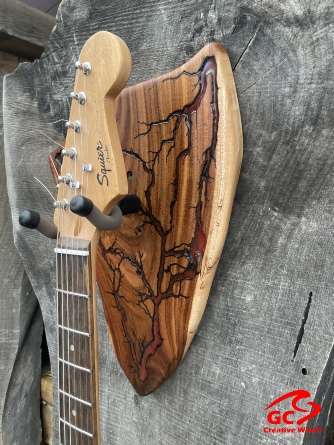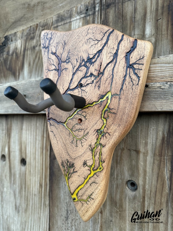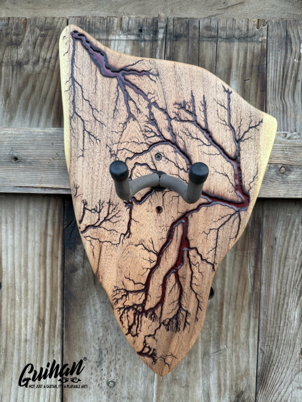 ►DESIGN: This is an inspired guitar hanger custom hand-crafted features a fractal art design. This creative art is a tribute to a person who has been a profound influence on my musical life since childhood. It stands as a symbol of my gratitude for his immense talent and lasting impact on the world of music. ►DISCLAIMER: GC Creative Works/Guihan Guitars is not affiliated with, or endorsed, sponsored, or supported by any professional musician artists. The name and picture are merely for descriptive purposes only. The guitar in the picture is not included. It is solely used for descriptive visual purposes only. ►WOOD: Arizona grown desert hardwood is uniquely hand-crafted and custom designed from weathered-down trees found in metropolitan Phoenix areas. By recovering the logs, allows me to create a 100% sustainable guitar hanger. Note* Since the fractal art is uniquely done to each wood, the picture shown above is not the exact fractal design you'll receive. The shape and size will be the same. ►FRACTAL ART: A process of applying 20,000 volts of electricity to the wood surface recreating a lightning strike in slow motion as well as unique abstract figures, tree and vein like shapes. It is sealed with epoxy inlay ink self-leveling high gloss U.V. resistant formula. ►EPOXY: Self-leveling high gloss U.V. A resistant formula epoxy with color pigment is added to seal the burns created during fractal art process on the surface of the wood. The colors available are: (Angel White, Aqua Marine, Arizona Gold, Army Green, Black, Blue Metallic, Cardinal Metallic, Caribbean Blue, Desert Copper, Emerald Metallic, Golden Yellow, Gray Metallic, Hot Pink, Hunter Green, Orange Crush, Pearl White, Purple Metallic, Red Metallic, Silver Grey, Teal Metallic, Turquoise Blue. Other colors available upon request.) ►OIL FINISH: Hand rubbed Old Masters clear satin gel polyurethane and food grade oils to bring out the natural beauty of wooden surfaces. ►STRING SWING HARDWARE: The new design, known as the “Guitar Keeper”, has a deep cradle design that prevents the guitar from being improperly placed into the hanger. This ultimately provides a safer hanger for your instrument, as the guitar needs to be lifted 2 inches and brought forward to be removed. The pivoting yoke allows for Electric, Acoustic or Bass guitar headstocks to be cradled perfectly while still hanging straight. Made in the USA. ►DESIGN ENGINEERING: Garie Chavez has researched and tested the use of proper hardware for mounting the String Swing guitar hanger to live edge wood materials. A threaded insert made of carbon steel zinc plated finish goes into a pre pre-drilled hole and has internal threads. It offers a strong permanent thread to live edge hardwood and mount the guitar hanger yoke. Mounting hardware included with two drywall anchors and two 2-inch Phillips wood screws. ►MOUNTING INSTRUCTIONS: To mount on existing stud walls, drive the screws through pre-drilled pilot holes of the hanger into the wall using a Phillips screwdriver. If a wall stud is not found, mark the pilot holes on the guitar hanger using a Phillips screwdriver to push and turn the aluminum wall anchor clockwise until flush. Mount the guitar hanger with screws provided through the pilot holes and secure into drywall anchors. GC Creative Works is not responsible for any damages to the musical instrument for any improper installation of the guitar hanger to the wall.It is the sole responsibility of the owner/buyer to properly install the guitar hanger to the wall. ►DONATION: GC Creative Works donate part of the sales of guitar hanger fractal art to Sweet Relief Musicians Fund. A 501-C3 non profit charity that provides services and financial assistance for all types of career musicians and music industry professionals. Thank you for your support. ►PAYMENT TERMS: PAYPAL secure shopping cart is used on this website for online purchases. ►DIMENSIONS: Height: 15-16 inches Width: 8-10 inches Thickness: 1-1-1/4 inch ►SHIPPING TERMS: Free to continental US states including Alaska, Hawaii and Puerto Rico. Standard Shipping takes 3 to 7 business days from the date of order received. Additional freight charges for International shipments. ►COMPLETION TIME: Please allow 3-7 days to complete from the time order is received.