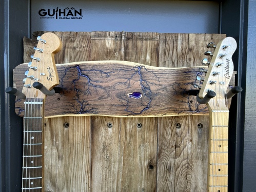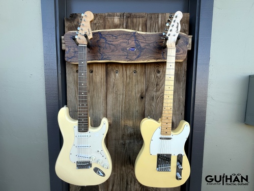 ►LIVE EDGE WOOD: Each live edge guitar hanger is uniquely hand-crafted and custom designed from weathered-down trees found around metropolitan Phoenix, Arizona. By acquiring these logs, it allows me to create 100% sustainable, re-purposed live edge wood art designs. Locally source and made in North Peoria, Arizona. ►FRACTAL ART: A process of applying 20,000 volts of electricity to the wood surface recreating a lightning strike in slow motion as well as unique abstract figures, tree and vein like shapes. It is sealed with epoxy inlay ink self-leveling high gloss U.V. resistant formula. ►EPOXY COLORS: ANGEL WHITE, AQUA MARINE, ARIZONA GOLD, ARMY GREEN, BLACK, CARDINAL METALLIC, CARIBBEAN BLUE, DESERT COPPER, EMERALD METALLIC, GOLDEN YELLOW, GRAY METALLIC, HOT PINK, HUNTER GREEN, ORANGE, PEARL WHITE, PURPLE METALLIC, RED, SKY BLUE, TEAL METALLIC, TURQUOISE BLUE ►OIL FINISH: Hand rubbed Old Masters clear satin gel polyurethane. It brings out the natural beauty of wooden surfaces; durable coating for use on wood surfaces and contains ultraviolet absorbers for advanced sun protection. ►GUITAR HARDWARE: The new design, known as the “Guitar Keeper”, has a deep cradle design that prevents the guitar from being improperly placed into the hanger. This ultimately provides a safer hanger for your instrument, as the guitar needs to be lifted 2 inches and brought forward to be removed. The pivoting yoke allows for Electric, Acoustic or Bass guitar headstocks to be cradled perfectly while still hanging straight. Made in the USA. ►ENGINEERING: GC Creative Works has researched and tested the use of proper hardware for mounting the String Swing guitar hanger to live edge wood materials. A threaded insert made of carbon steel zinc plated finished goes into predrilled hole and has internal threads. It offers a strong permanent thread to live edge hardwood and mount the guitar hanger yoke. Mounting hardware included with drywall anchors and 2-inch Phillips wood screws. ►DIMENSIONS: Length: 30 inches Width: 8 inches ►DISCLAIMER: It is the sole responsibility of the owner/buyer to properly install the guitar hanger to the wall. GC Creative Works is not responsible for any damages to the musical instrument for any improper installation of the guitar hanger to the wall. ►COMPLETION TIMELINE: Please allow 7-10 days to complete from the time order is received.