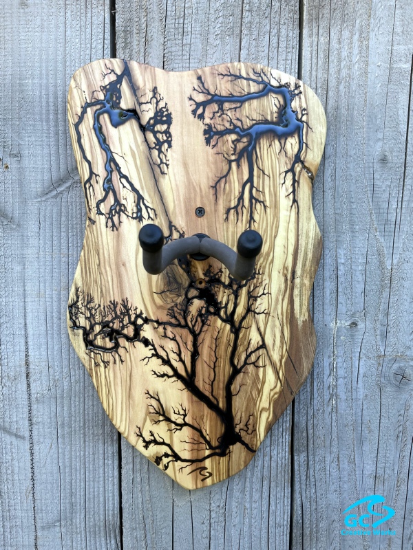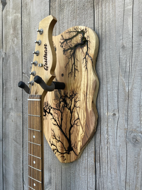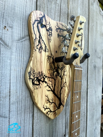 ►INSPIRATION: The creative design behind each guitar hanger is based on the musicians I’ve come to admire throughout my lifetime that made an impact and inspired me to play guitar. It’s my token of appreciation for creating great music of my generation. Keep ROCKING the world! ►DISCLAIMER: GC Creative Works is not affiliated with, or endorsed, sponsored, or supported by any professional musician artists. The names and images are merely for descriptive purposes only. ►DONATION: GC Creative Works donate part of the guitar hanger sale to MusiCares. A non-profit organization that helps the humans behind music because music gives so much to the world. Thank you for your support. ►LIVEEDGEWOOD: Each live edge guitar hanger is uniquely hand-crafted and custom designed from weathered-down trees found around metropolitan Phoenix, Arizona. By acquiring these logs, it allows me to create 100% sustainable, re-purposed live edge wood art designs. Locally source and made in North Peoria, Arizona. ►FRACTALART: A process of applying 20,000 volts of electricity to the wood surface recreating a lightning strike in slow motion as well as unique abstract figures, tree and vein like shapes. It is sealed with epoxy inlay ink self-leveling high gloss U.V. resistant formula. ►EPOXYCOLORS: Angel White, Aqua Marine, Arizona Gold, Army Green, Black, Blue Metallic, Cardinal Metallic, Caribbean Blue, Desert Copper, Emerald Metallic, Golden Yellow, Gray Metallic, Hot Pink, Hunter Green, Neon Green, Orange Crush, Pearl White, Purple Metallic, Red Metallic, Silver Grey, Teal Metallic, Turquoise Blue. Other colors available upon request. ►OILFINISH: Hand rubbed Old Masters clear satin gel polyurethane and food grade oils to bring out the natural beauty of wooden surfaces. ►GUITARHARDWARE: The new design, known as the “Guitar Keeper”, has a deep cradle design that prevents the guitar from being improperly placed into the hanger. This ultimately provides a safer hanger for your instrument, as the guitar needs to be lifted 2 inches and brought forward to be removed. The pivoting yoke allows for Electric, Acoustic or Bass guitar headstocks to be cradled perfectly while still hanging straight. Made in the USA. ►ENGINEERING: GC Creative Works researched and tested the use of proper hardware for mounting the String Swing guitar hanger to live edge wood materials. A threaded insert made of carbon steel zinc plated finished goes into predrilled hole and has internal threads. It offers a strong permanent thread to live edge hardwood and mount the guitar hanger yoke. Mounting hardware included with two drywall anchors and two 2-inch Phillips wood screws. ►MOUNTING INSTRUCTIONS: To mount on existing stud walls, drive the screws through pre-drilled pilot holes of hanger into wall using a Phillips screwdriver. If a wall stud is not found, mark the pilot holes on the guitar hanger using a Phillips screwdriver to push and turn the aluminum wall anchor clockwise until flush. Mount the guitar hanger with screws provided through the pilot holes and secure into drywall anchors. GC Creative Works is not responsible for any damages to the musical instrument for any improper installation of the guitar hanger to the wall.It is the sole responsibility of the owner/buyer to properly install the guitar hanger to the wall. ►DIMENSIONS: Height: 15-16 inches Width: 8-10 inches Thickness: 1-1-1/4 inch ►COMPLETIONTIMELINE: Please allow 3-7 days to complete from the time order is received.