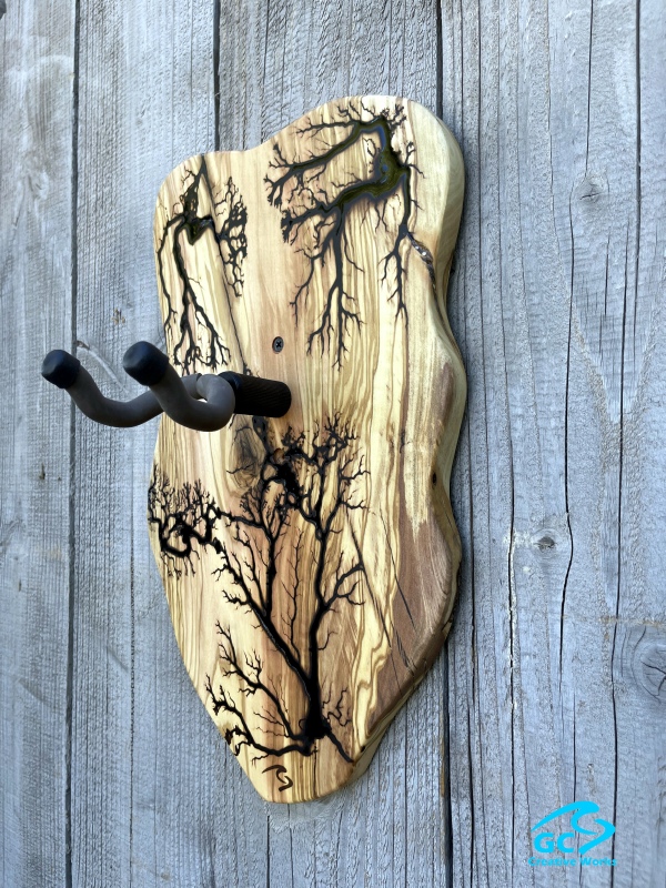 ►DESIGN: This is an inspired guitar hanger custom hand-crafted features a fractal art design. This creative art is a tribute to a person who has been a profound influence on my musical life since childhood. It stands as a symbol of my gratitude for his immense talent and lasting impact on the world of music. ►DISCLAIMER: GC Creative Works/Guihan Guitars is not affiliated with, or endorsed, sponsored, or supported by any professional musician artists. The name and picture are merely for descriptive purposes only. The guitar in the picture is not included. It is solely used for descriptive visual purposes only. ►WOOD: Arizona grown desert hardwood is uniquely hand-crafted and custom designed from weathered-down trees found in metropolitan Phoenix areas. By recovering the logs, allows me to create a 100% sustainable guitar hanger. Note* Since the fractal art is uniquely done to each wood, the picture shown above is not the exact fractal design you'll receive. The shape and size will be the same. ►FRACTAL ART: A process of applying 20,000 volts of electricity to the wood surface recreating a lightning strike in slow motion as well as unique abstract figures, tree and vein like shapes. It is sealed with epoxy inlay ink self-leveling high gloss U.V. resistant formula. ►EPOXY: Self-leveling high gloss U.V. A resistant formula epoxy with color pigment is added to seal the burns created during fractal art process on the surface of the wood. The colors available are: (Angel White, Aqua Marine, Arizona Gold, Army Green, Black, Blue Metallic, Cardinal Metallic, Caribbean Blue, Desert Copper, Emerald Metallic, Golden Yellow, Gray Metallic, Hot Pink, Hunter Green, Orange Crush, Pearl White, Purple Metallic, Red Metallic, Silver Grey, Teal Metallic, Turquoise Blue. Other colors available upon request.) ►OIL FINISH: Hand rubbed Old Masters clear satin gel polyurethane and food grade oils to bring out the natural beauty of wooden surfaces. ►STRING SWING HARDWARE: The new design, known as the “Guitar Keeper”, has a deep cradle design that prevents the guitar from being improperly placed into the hanger. This ultimately provides a safer hanger for your instrument, as the guitar needs to be lifted 2 inches and brought forward to be removed. The pivoting yoke allows for Electric, Acoustic or Bass guitar headstocks to be cradled perfectly while still hanging straight. Made in the USA. ►DESIGN ENGINEERING: Garie Chavez has researched and tested the use of proper hardware for mounting the String Swing guitar hanger to live edge wood materials. A threaded insert made of carbon steel zinc plated finish goes into a pre pre-drilled hole and has internal threads. It offers a strong permanent thread to live edge hardwood and mount the guitar hanger yoke. Mounting hardware included with two drywall anchors and two 2-inch Phillips wood screws. ►MOUNTING INSTRUCTIONS: To mount on existing stud walls, drive the screws through pre-drilled pilot holes of the hanger into the wall using a Phillips screwdriver. If a wall stud is not found, mark the pilot holes on the guitar hanger using a Phillips screwdriver to push and turn the aluminum wall anchor clockwise until flush. Mount the guitar hanger with screws provided through the pilot holes and secure into drywall anchors. GC Creative Works is not responsible for any damages to the musical instrument for any improper installation of the guitar hanger to the wall.It is the sole responsibility of the owner/buyer to properly install the guitar hanger to the wall. ►DONATION: GC Creative Works donate part of the sales of guitar hanger fractal art to Sweet Relief Musicians Fund. A 501-C3 non profit charity that provides services and financial assistance for all types of career musicians and music industry professionals. Thank you for your support. ►PAYMENT TERMS: PAYPAL secure shopping cart is used on this website for online purchases. ►DIMENSIONS: Height: 15-16 inches Width: 8-10 inches Thickness: 1-1-1/4 inch ►SHIPPING TERMS: Free to continental US states including Alaska, Hawaii and Puerto Rico. Standard Shipping takes 3 to 7 business days from the date of order received. Additional freight charges for International shipments. ►COMPLETION TIME: Please allow 3-7 days to complete from the time order is received.