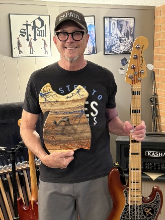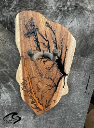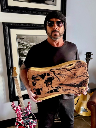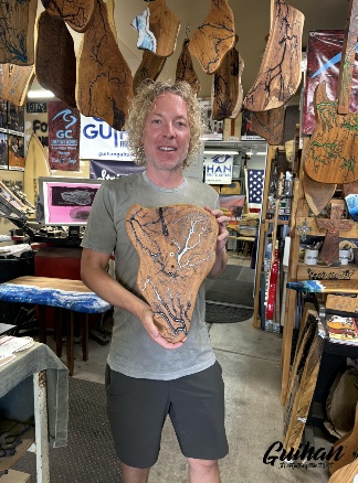 ►DESIGN: This is an inspired guitar hanger custom hand-crafted features a fractal art design. This creative art is a tribute to a person who has been a profound influence on my musical life since childhood. It stands as a symbol of my gratitude for his immense talent and lasting impact on the world of music. ►DISCLAIMER: GC Creative Works/Guihan Guitars is not affiliated with, or endorsed, sponsored, or supported by any professional musician artists. The name and picture are merely for descriptive purposes only. The guitar in the picture is not included. It is solely used for descriptive visual purposes only. ►WOOD: Arizona grown desert hardwood is uniquely hand-crafted and custom designed from weathered-down trees found in metropolitan Phoenix areas. By recovering the logs, allows me to create a 100% sustainable guitar hanger. Note* Since the fractal art is uniquely done to each wood, the picture shown above is not the exact fractal design you'll receive. The shape and size will be the same. ►FRACTAL ART: A process of applying 20,000 volts of electricity to the wood surface recreating a lightning strike in slow motion as well as unique abstract figures, tree and vein like shapes. It is sealed with epoxy inlay ink self-leveling high gloss U.V. resistant formula. ►EPOXY: Self-leveling high gloss U.V. A resistant formula epoxy with color pigment is added to seal the burns created during fractal art process on the surface of the wood. The colors available are: (Angel White, Aqua Marine, Arizona Gold, Army Green, Black, Blue Metallic, Cardinal Metallic, Caribbean Blue, Desert Copper, Emerald Metallic, Golden Yellow, Gray Metallic, Hot Pink, Hunter Green, Orange Crush, Pearl White, Purple Metallic, Red Metallic, Silver Grey, Teal Metallic, Turquoise Blue. Other colors available upon request.) ►OIL FINISH: Hand rubbed Old Masters clear satin gel polyurethane and food grade oils to bring out the natural beauty of wooden surfaces. ►STRING SWING HARDWARE: The new design, known as the “Guitar Keeper”, has a deep cradle design that prevents the guitar from being improperly placed into the hanger. This ultimately provides a safer hanger for your instrument, as the guitar needs to be lifted 2 inches and brought forward to be removed. The pivoting yoke allows for Electric, Acoustic or Bass guitar headstocks to be cradled perfectly while still hanging straight. Made in the USA. ►DESIGN ENGINEERING: Garie Chavez has researched and tested the use of proper hardware for mounting the String Swing guitar hanger to live edge wood materials. A threaded insert made of carbon steel zinc plated finish goes into a pre pre-drilled hole and has internal threads. It offers a strong permanent thread to live edge hardwood and mount the guitar hanger yoke. Mounting hardware included with two drywall anchors and two 2-inch Phillips wood screws. ►MOUNTING INSTRUCTIONS: To mount on existing stud walls, drive the screws through pre-drilled pilot holes of the hanger into the wall using a Phillips screwdriver. If a wall stud is not found, mark the pilot holes on the guitar hanger using a Phillips screwdriver to push and turn the aluminum wall anchor clockwise until flush. Mount the guitar hanger with screws provided through the pilot holes and secure into drywall anchors. GC Creative Works is not responsible for any damages to the musical instrument for any improper installation of the guitar hanger to the wall.It is the sole responsibility of the owner/buyer to properly install the guitar hanger to the wall. ►DONATION: GC Creative Works donate part of the sales of guitar hanger fractal art to Sweet Relief Musicians Fund. A 501-C3 non profit charity that provides services and financial assistance for all types of career musicians and music industry professionals. Thank you for your support. ►PAYMENT TERMS: PAYPAL secure shopping cart is used on this website for online purchases. ►DIMENSIONS: Height: 15-16 inches Width: 8-10 inches Thickness: 1-1-1/4 inch ►SHIPPING TERMS: Free to continental US states including Alaska, Hawaii and Puerto Rico. Standard Shipping takes 3 to 7 business days from the date of order received. Additional freight charges for International shipments. ►COMPLETION TIME: Please allow 3-7 days to complete from the time order is received.