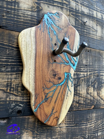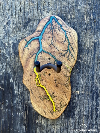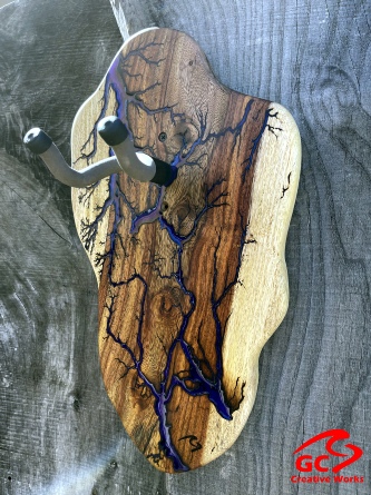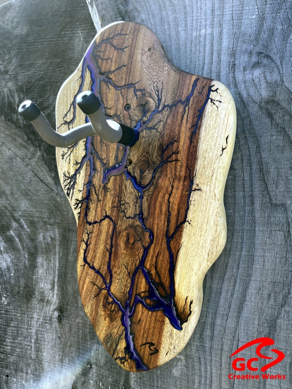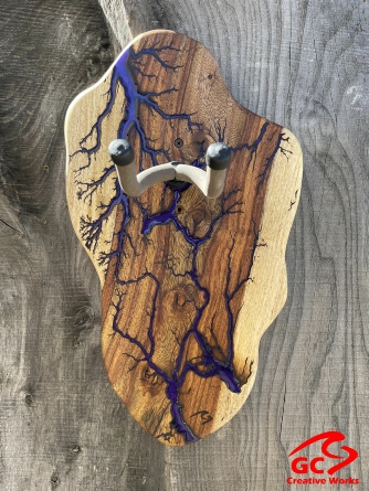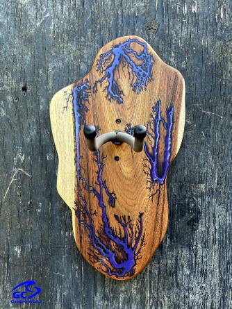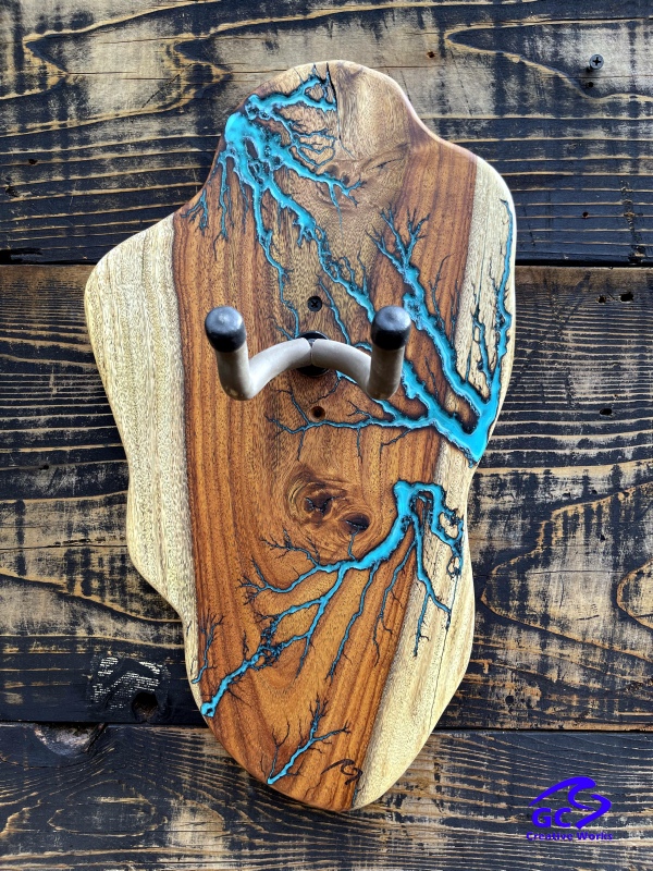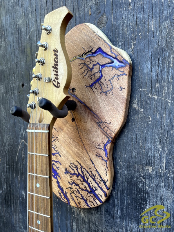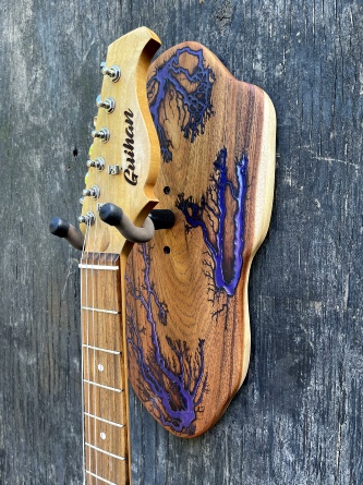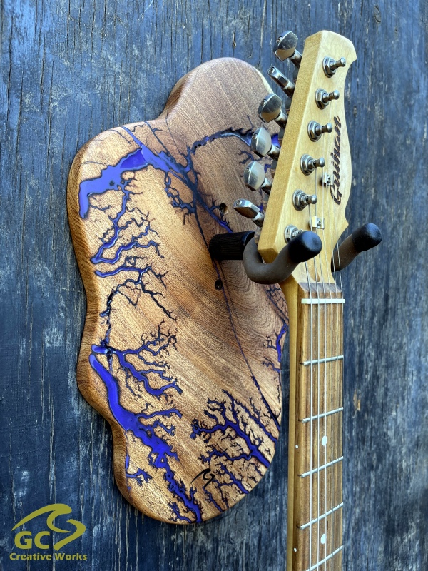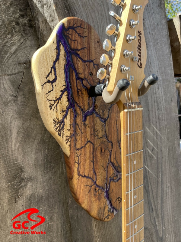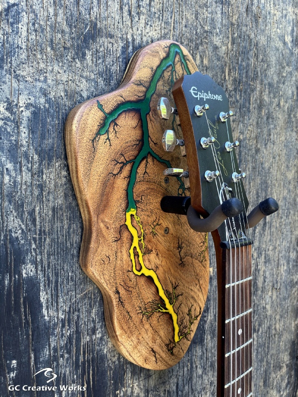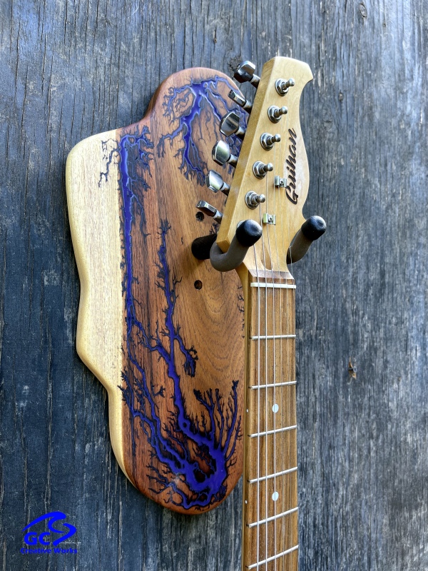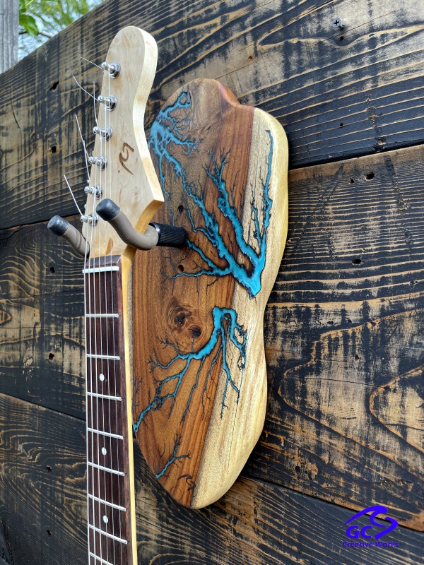 ►DESIGN: This is an inspired guitar hanger custom hand-crafted features a fractal art design. This creative art is a tribute to a person who has been a profound influence on my musical life since childhood. It stands as a symbol of my gratitude for his immense talent and lasting impact on the world of music. ►DISCLAIMER: GC Creative Works/Guihan Guitars is not affiliated with, or endorsed, sponsored, or supported by any professional musician artists. The name and picture are merely for descriptive purposes only. The guitar in the picture is not included. It is solely used for descriptive visual purposes only. ►WOOD: Arizona grown desert hardwood is uniquely hand-crafted and custom designed from weathered-down trees found in metropolitan Phoenix areas. By recovering the logs, allows me to create a 100% sustainable guitar hanger. Note* Since the fractal art is uniquely done to each wood, the picture shown above is not the exact fractal design you'll receive. The shape and size will be the same. ►FRACTAL ART: A process of applying 20,000 volts of electricity to the wood surface recreating a lightning strike in slow motion as well as unique abstract figures, tree and vein like shapes. It is sealed with epoxy inlay ink self-leveling high gloss U.V. resistant formula. ►EPOXY: Self-leveling high gloss U.V. A resistant formula epoxy with color pigment is added to seal the burns created during fractal art process on the surface of the wood. The colors available are: (Angel White, Aqua Marine, Arizona Gold, Army Green, Black, Blue Metallic, Cardinal Metallic, Caribbean Blue, Desert Copper, Emerald Metallic, Golden Yellow, Gray Metallic, Hot Pink, Hunter Green, Orange Crush, Pearl White, Purple Metallic, Red Metallic, Silver Grey, Teal Metallic, Turquoise Blue. Other colors available upon request.) ►OIL FINISH: Hand rubbed Old Masters clear satin gel polyurethane and food grade oils to bring out the natural beauty of wooden surfaces. ►STRING SWING HARDWARE: The new design, known as the “Guitar Keeper”, has a deep cradle design that prevents the guitar from being improperly placed into the hanger. This ultimately provides a safer hanger for your instrument, as the guitar needs to be lifted 2 inches and brought forward to be removed. The pivoting yoke allows for Electric, Acoustic or Bass guitar headstocks to be cradled perfectly while still hanging straight. Made in the USA. ►DESIGN ENGINEERING: Garie Chavez has researched and tested the use of proper hardware for mounting the String Swing guitar hanger to live edge wood materials. A threaded insert made of carbon steel zinc plated finish goes into a pre pre-drilled hole and has internal threads. It offers a strong permanent thread to live edge hardwood and mount the guitar hanger yoke. Mounting hardware included with two drywall anchors and two 2-inch Phillips wood screws. ►MOUNTING INSTRUCTIONS: To mount on existing stud walls, drive the screws through pre-drilled pilot holes of the hanger into the wall using a Phillips screwdriver. If a wall stud is not found, mark the pilot holes on the guitar hanger using a Phillips screwdriver to push and turn the aluminum wall anchor clockwise until flush. Mount the guitar hanger with screws provided through the pilot holes and secure into drywall anchors. GC Creative Works is not responsible for any damages to the musical instrument for any improper installation of the guitar hanger to the wall.It is the sole responsibility of the owner/buyer to properly install the guitar hanger to the wall. ►DONATION: GC Creative Works donate part of the sales of guitar hanger fractal art to Sweet Relief Musicians Fund. A 501-C3 non profit charity that provides services and financial assistance for all types of career musicians and music industry professionals. Thank you for your support. ►PAYMENT TERMS: PAYPAL secure shopping cart is used on this website for online purchases. ►DIMENSIONS: Height: 15-16 inches Width: 8-10 inches Thickness: 1-1-1/4 inch ►SHIPPING TERMS: Free to continental US states including Alaska, Hawaii and Puerto Rico. Standard Shipping takes 3 to 7 business days from the date of order received. Additional freight charges for International shipments. ►COMPLETION TIME: Please allow 3-7 days to complete from the time order is received.