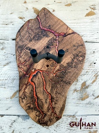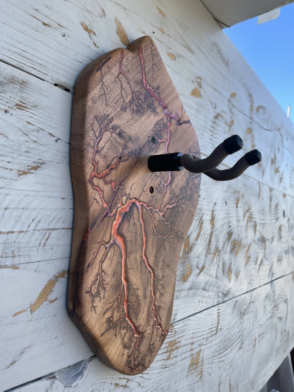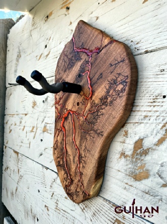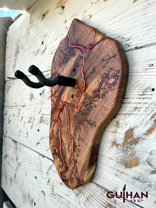 ►DESIGN: This is an inspired guitar hanger custom hand-crafted features a fractal art design. This creative art is a tribute to a person who has been a profound influence on my musical life since childhood. It stands as a symbol of my gratitude for his immense talent and lasting impact on the world of music. ►DISCLAIMER: GC Creative Works/Guihan Guitars is not affiliated with, or endorsed, sponsored, or supported by any professional musician artists. The name and picture are merely for descriptive purposes only. The guitar in the picture is not included. It is solely used for descriptive visual purposes only. ►WOOD: Arizona grown desert hardwood is uniquely hand-crafted and custom designed from weathered-down trees found in metropolitan Phoenix areas. By recovering the logs, allows me to create a 100% sustainable guitar hanger. Note* Since the fractal art is uniquely done to each wood, the picture shown above is not the exact fractal design you'll receive. The shape and size will be the same. ►FRACTAL ART: A process of applying 20,000 volts of electricity to the wood surface recreating a lightning strike in slow motion as well as unique abstract figures, tree and vein like shapes. It is sealed with epoxy inlay ink self-leveling high gloss U.V. resistant formula. ►EPOXY: Self-leveling high gloss U.V. A resistant formula epoxy with color pigment is added to seal the burns created during fractal art process on the surface of the wood. The colors available are: (Angel White, Aqua Marine, Arizona Gold, Army Green, Black, Blue Metallic, Cardinal Metallic, Caribbean Blue, Desert Copper, Emerald Metallic, Golden Yellow, Gray Metallic, Hot Pink, Hunter Green, Orange Crush, Pearl White, Purple Metallic, Red Metallic, Silver Grey, Teal Metallic, Turquoise Blue. Other colors available upon request.) ►OIL FINISH: Hand rubbed Old Masters clear satin gel polyurethane and food grade oils to bring out the natural beauty of wooden surfaces. ►STRING SWING HARDWARE: The new design, known as the “Guitar Keeper”, has a deep cradle design that prevents the guitar from being improperly placed into the hanger. This ultimately provides a safer hanger for your instrument, as the guitar needs to be lifted 2 inches and brought forward to be removed. The pivoting yoke allows for Electric, Acoustic or Bass guitar headstocks to be cradled perfectly while still hanging straight. Made in the USA. ►DESIGN ENGINEERING: Garie Chavez has researched and tested the use of proper hardware for mounting the String Swing guitar hanger to live edge wood materials. A threaded insert made of carbon steel zinc plated finish goes into a pre pre-drilled hole and has internal threads. It offers a strong permanent thread to live edge hardwood and mount the guitar hanger yoke. Mounting hardware included with two drywall anchors and two 2-inch Phillips wood screws. ►MOUNTING INSTRUCTIONS: To mount on existing stud walls, drive the screws through pre-drilled pilot holes of the hanger into the wall using a Phillips screwdriver. If a wall stud is not found, mark the pilot holes on the guitar hanger using a Phillips screwdriver to push and turn the aluminum wall anchor clockwise until flush. Mount the guitar hanger with screws provided through the pilot holes and secure into drywall anchors. GC Creative Works is not responsible for any damages to the musical instrument for any improper installation of the guitar hanger to the wall.It is the sole responsibility of the owner/buyer to properly install the guitar hanger to the wall. ►DONATION: GC Creative Works donate part of the sales of guitar hanger fractal art to Sweet Relief Musicians Fund. A 501-C3 non profit charity that provides services and financial assistance for all types of career musicians and music industry professionals. Thank you for your support. ►PAYMENT TERMS: PAYPAL secure shopping cart is used on this website for online purchases. ►DIMENSIONS: Height: 15-16 inches Width: 8-10 inches Thickness: 1-1-1/4 inch ►SHIPPING TERMS: Free to continental US states including Alaska, Hawaii and Puerto Rico. Standard Shipping takes 3 to 7 business days from the date of order received. Additional freight charges for International shipments. ►COMPLETION TIME: Please allow 3-7 days to complete from the time order is received.