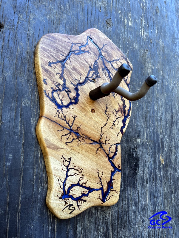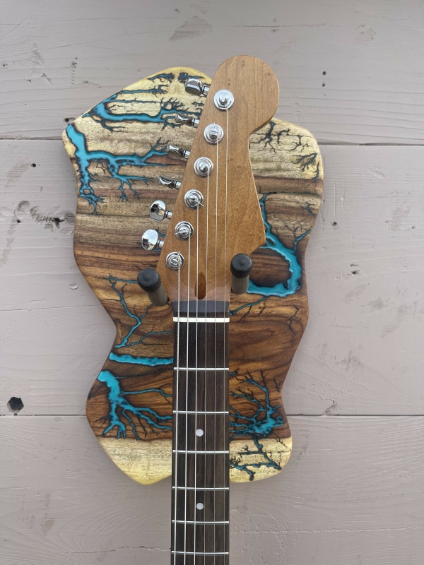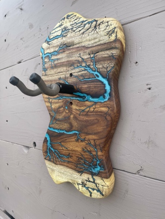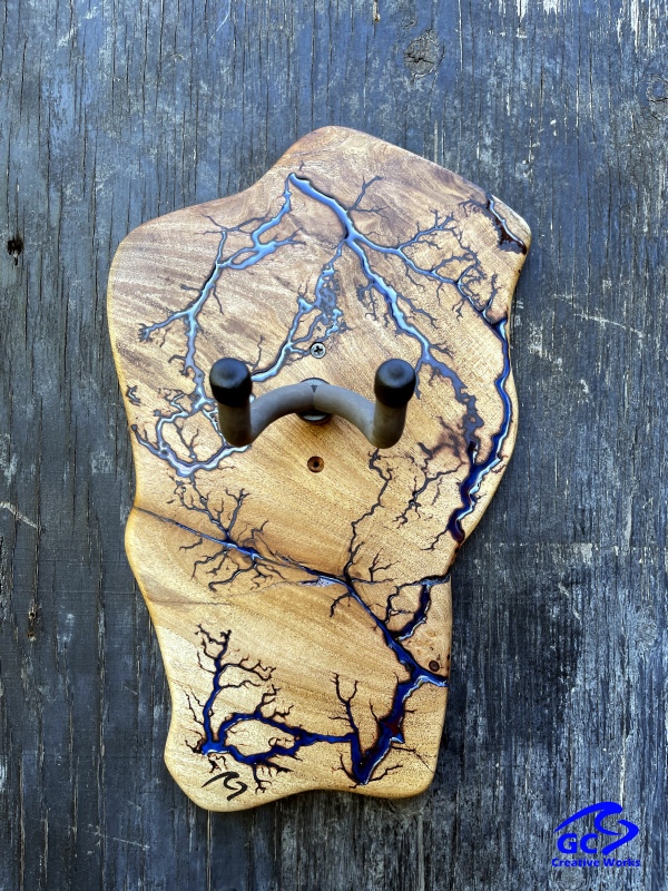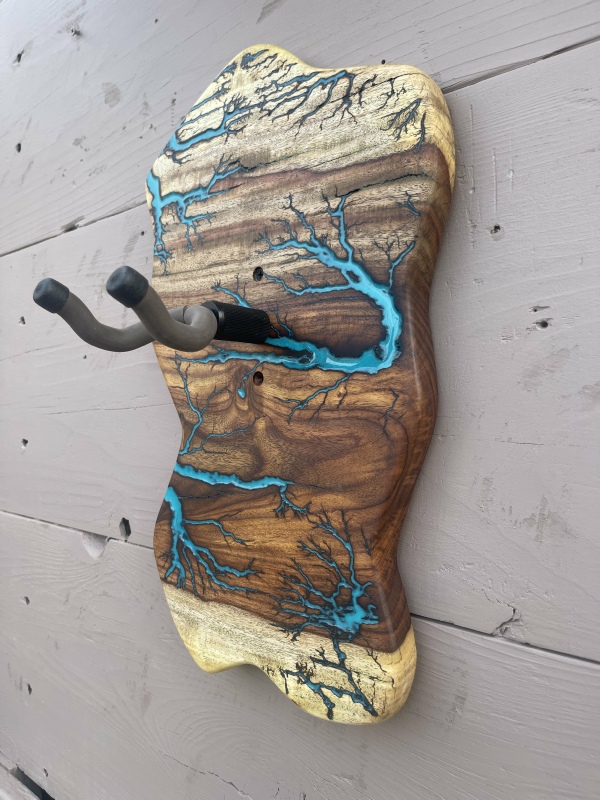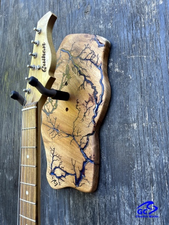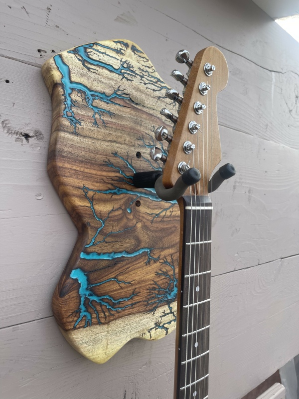 ►INSPIRATION: The creative design behind each guitar hanger is based on the musicians I’ve come to admire throughout my lifetime that made an impact and inspired me to play guitar. It’s my token of appreciation for creating great music of my generation. Keep ROCKING the world! ►DISCLAIMER: GC Creative Works is not affiliated with, or endorsed, sponsored, or supported by any professional musician artists. The names and images are merely for descriptive purposes only. ►DONATION: GC Creative Works donate part of the guitar hanger sale to MusiCares. A non-profit organization that helps the humans behind music because music gives so much to the world. Thank you for your support. ►LIVEEDGEWOOD: Each live edge guitar hanger is uniquely hand-crafted and custom designed from weathered-down trees found around metropolitan Phoenix, Arizona. By acquiring these logs, it allows me to create 100% sustainable, re-purposed live edge wood art designs. Locally source and made in North Peoria, Arizona. ►FRACTALART: A process of applying 20,000 volts of electricity to the wood surface recreating a lightning strike in slow motion as well as unique abstract figures, tree and vein like shapes. It is sealed with epoxy inlay ink self-leveling high gloss U.V. resistant formula. ►EPOXYCOLORS: Angel White, Aqua Marine, Arizona Gold, Army Green, Black, Blue Metallic, Cardinal Metallic, Caribbean Blue, Desert Copper, Emerald Metallic, Golden Yellow, Gray Metallic, Hot Pink, Hunter Green, Neon Green, Orange Crush, Pearl White, Purple Metallic, Red Metallic, Silver Grey, Teal Metallic, Turquoise Blue. Other colors available upon request. ►OILFINISH: Hand rubbed Old Masters clear satin gel polyurethane and food grade oils to bring out the natural beauty of wooden surfaces. ►GUITARHARDWARE: The new design, known as the “Guitar Keeper”, has a deep cradle design that prevents the guitar from being improperly placed into the hanger. This ultimately provides a safer hanger for your instrument, as the guitar needs to be lifted 2 inches and brought forward to be removed. The pivoting yoke allows for Electric, Acoustic or Bass guitar headstocks to be cradled perfectly while still hanging straight. Made in the USA. ►ENGINEERING: GC Creative Works researched and tested the use of proper hardware for mounting the String Swing guitar hanger to live edge wood materials. A threaded insert made of carbon steel zinc plated finished goes into predrilled hole and has internal threads. It offers a strong permanent thread to live edge hardwood and mount the guitar hanger yoke. Mounting hardware included with two drywall anchors and two 2-inch Phillips wood screws. ►MOUNTING INSTRUCTIONS: To mount on existing stud walls, drive the screws through pre-drilled pilot holes of hanger into wall using a Phillips screwdriver. If a wall stud is not found, mark the pilot holes on the guitar hanger using a Phillips screwdriver to push and turn the aluminum wall anchor clockwise until flush. Mount the guitar hanger with screws provided through the pilot holes and secure into drywall anchors. GC Creative Works is not responsible for any damages to the musical instrument for any improper installation of the guitar hanger to the wall.It is the sole responsibility of the owner/buyer to properly install the guitar hanger to the wall. ►DIMENSIONS: Height: 15-16 inches Width: 8-10 inches Thickness: 1-1-1/4 inch ►COMPLETIONTIMELINE: Please allow 3-7 days to complete from the time order is received.