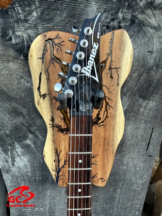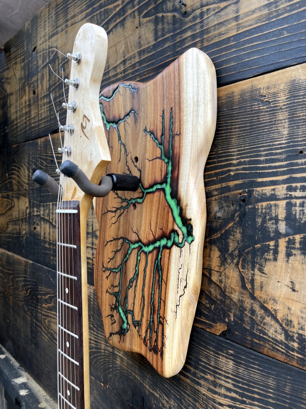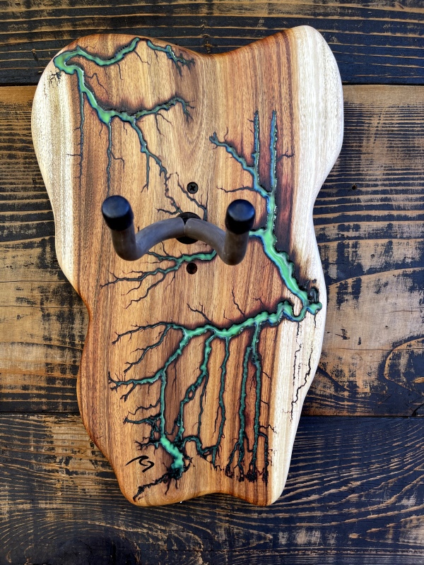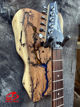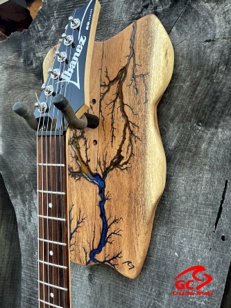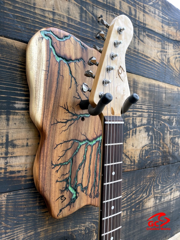 ►INSPIRATION: The creative design behind each guitar hanger is based on the musicians I’ve come to admire throughout my lifetime that made an impact and inspired me to play guitar. It’s my token of appreciation for creating great music of my generation. Keep ROCKING the world! ►DISCLAIMER: GC Creative Works is not affiliated with, or endorsed, sponsored, or supported by any professional musician artists. The names and images are merely for descriptive purposes only. ►DONATION: GC Creative Works donate part of the guitar hanger sale to MusiCares. A non-profit organization that helps the humans behind music because music gives so much to the world. Thank you for your support. ►LIVEEDGEWOOD: Each live edge guitar hanger is uniquely hand-crafted and custom designed from weathered-down trees found around metropolitan Phoenix, Arizona. By acquiring these logs, it allows me to create 100% sustainable, re-purposed live edge wood art designs. Locally source and made in North Peoria, Arizona. ►FRACTALART: A process of applying 20,000 volts of electricity to the wood surface recreating a lightning strike in slow motion as well as unique abstract figures, tree and vein like shapes. It is sealed with epoxy inlay ink self-leveling high gloss U.V. resistant formula. ►EPOXYCOLORS: Angel White, Aqua Marine, Arizona Gold, Army Green, Black, Blue Metallic, Cardinal Metallic, Caribbean Blue, Desert Copper, Emerald Metallic, Golden Yellow, Gray Metallic, Hot Pink, Hunter Green, Neon Green, Orange Crush, Pearl White, Purple Metallic, Red Metallic, Silver Grey, Teal Metallic, Turquoise Blue. Other colors available upon request. ►OILFINISH: Hand rubbed Old Masters clear satin gel polyurethane and food grade oils to bring out the natural beauty of wooden surfaces. ►GUITARHARDWARE: The new design, known as the “Guitar Keeper”, has a deep cradle design that prevents the guitar from being improperly placed into the hanger. This ultimately provides a safer hanger for your instrument, as the guitar needs to be lifted 2 inches and brought forward to be removed. The pivoting yoke allows for Electric, Acoustic or Bass guitar headstocks to be cradled perfectly while still hanging straight. Made in the USA. ►ENGINEERING: GC Creative Works researched and tested the use of proper hardware for mounting the String Swing guitar hanger to live edge wood materials. A threaded insert made of carbon steel zinc plated finished goes into predrilled hole and has internal threads. It offers a strong permanent thread to live edge hardwood and mount the guitar hanger yoke. Mounting hardware included with two drywall anchors and two 2-inch Phillips wood screws. ►MOUNTING INSTRUCTIONS: To mount on existing stud walls, drive the screws through pre-drilled pilot holes of hanger into wall using a Phillips screwdriver. If a wall stud is not found, mark the pilot holes on the guitar hanger using a Phillips screwdriver to push and turn the aluminum wall anchor clockwise until flush. Mount the guitar hanger with screws provided through the pilot holes and secure into drywall anchors. GC Creative Works is not responsible for any damages to the musical instrument for any improper installation of the guitar hanger to the wall.It is the sole responsibility of the owner/buyer to properly install the guitar hanger to the wall. ►DIMENSIONS: Height: 15-16 inches Width: 8-10 inches Thickness: 1-1-1/4 inch ►COMPLETIONTIMELINE: Please allow 3-7 days to complete from the time order is received.