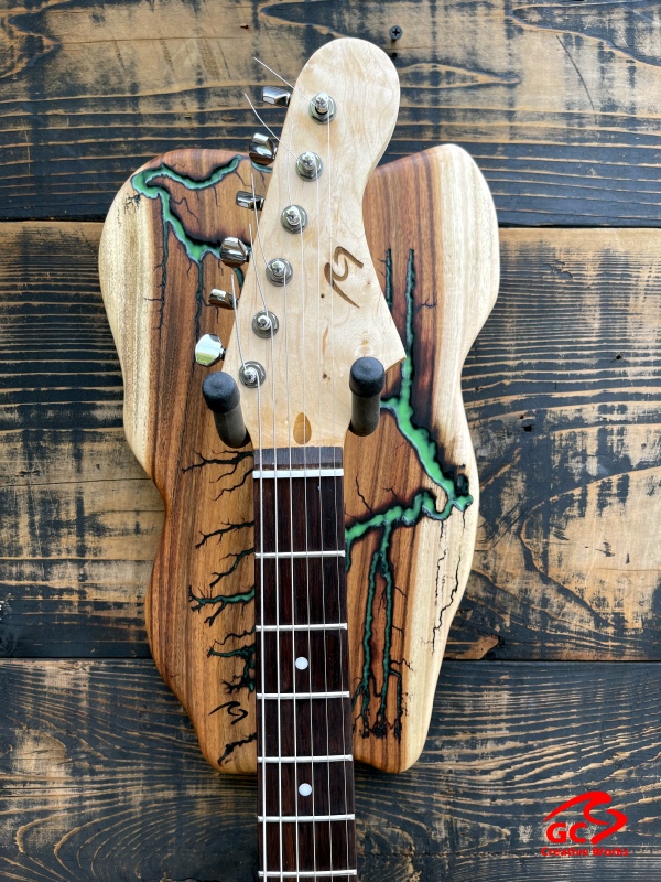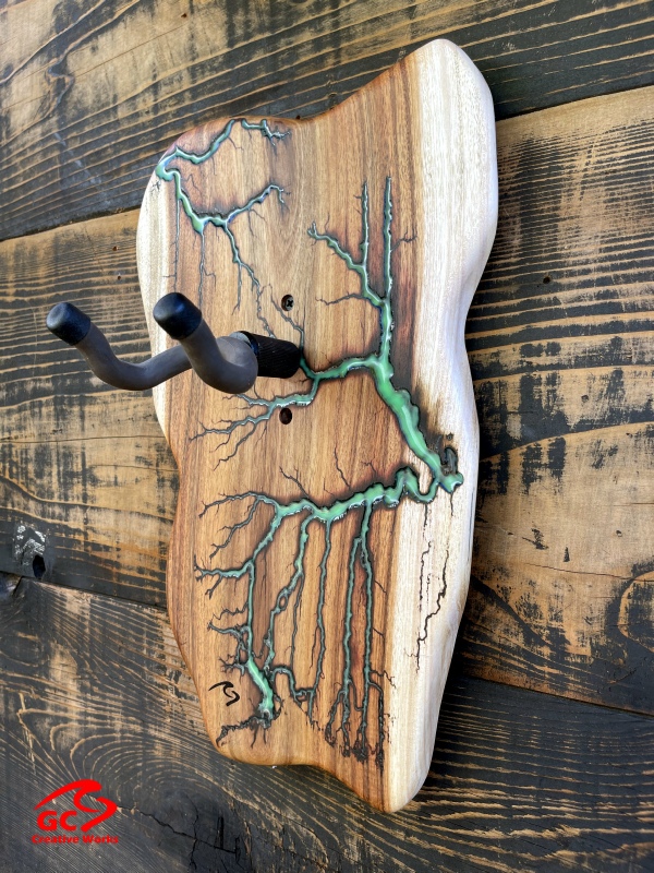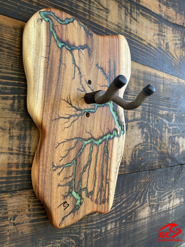 ►DESIGN: This is an inspired guitar hanger custom hand-crafted features a fractal art design. This creative art is a tribute to a person who has been a profound influence on my musical life since childhood. It stands as a symbol of my gratitude for his immense talent and lasting impact on the world of music. ►DISCLAIMER: GC Creative Works/Guihan Guitars is not affiliated with, or endorsed, sponsored, or supported by any professional musician artists. The name and picture are merely for descriptive purposes only. The guitar in the picture is not included. It is solely used for descriptive visual purposes only. ►WOOD: Arizona grown desert hardwood is uniquely hand-crafted and custom designed from weathered-down trees found in metropolitan Phoenix areas. By recovering the logs, allows me to create a 100% sustainable guitar hanger. Note* Since the fractal art is uniquely done to each wood, the picture shown above is not the exact fractal design you'll receive. The shape and size will be the same. ►FRACTAL ART: A process of applying 20,000 volts of electricity to the wood surface recreating a lightning strike in slow motion as well as unique abstract figures, tree and vein like shapes. It is sealed with epoxy inlay ink self-leveling high gloss U.V. resistant formula. ►EPOXY: Self-leveling high gloss U.V. A resistant formula epoxy with color pigment is added to seal the burns created during fractal art process on the surface of the wood. The colors available are: (Angel White, Aqua Marine, Arizona Gold, Army Green, Black, Blue Metallic, Cardinal Metallic, Caribbean Blue, Desert Copper, Emerald Metallic, Golden Yellow, Gray Metallic, Hot Pink, Hunter Green, Orange Crush, Pearl White, Purple Metallic, Red Metallic, Silver Grey, Teal Metallic, Turquoise Blue. Other colors available upon request.) ►OIL FINISH: Hand rubbed Old Masters clear satin gel polyurethane and food grade oils to bring out the natural beauty of wooden surfaces. ►STRING SWING HARDWARE: The new design, known as the “Guitar Keeper”, has a deep cradle design that prevents the guitar from being improperly placed into the hanger. This ultimately provides a safer hanger for your instrument, as the guitar needs to be lifted 2 inches and brought forward to be removed. The pivoting yoke allows for Electric, Acoustic or Bass guitar headstocks to be cradled perfectly while still hanging straight. Made in the USA. ►DESIGN ENGINEERING: Garie Chavez has researched and tested the use of proper hardware for mounting the String Swing guitar hanger to live edge wood materials. A threaded insert made of carbon steel zinc plated finish goes into a pre pre-drilled hole and has internal threads. It offers a strong permanent thread to live edge hardwood and mount the guitar hanger yoke. Mounting hardware included with two drywall anchors and two 2-inch Phillips wood screws. ►MOUNTING INSTRUCTIONS: To mount on existing stud walls, drive the screws through pre-drilled pilot holes of the hanger into the wall using a Phillips screwdriver. If a wall stud is not found, mark the pilot holes on the guitar hanger using a Phillips screwdriver to push and turn the aluminum wall anchor clockwise until flush. Mount the guitar hanger with screws provided through the pilot holes and secure into drywall anchors. GC Creative Works is not responsible for any damages to the musical instrument for any improper installation of the guitar hanger to the wall.It is the sole responsibility of the owner/buyer to properly install the guitar hanger to the wall. ►DONATION: GC Creative Works donate part of the sales of guitar hanger fractal art to Sweet Relief Musicians Fund. A 501-C3 non profit charity that provides services and financial assistance for all types of career musicians and music industry professionals. Thank you for your support. ►PAYMENT TERMS: PAYPAL secure shopping cart is used on this website for online purchases. ►DIMENSIONS: Height: 15-16 inches Width: 8-10 inches Thickness: 1-1-1/4 inch ►SHIPPING TERMS: Free to continental US states including Alaska, Hawaii and Puerto Rico. Standard Shipping takes 3 to 7 business days from the date of order received. Additional freight charges for International shipments. ►COMPLETION TIME: Please allow 3-7 days to complete from the time order is received.