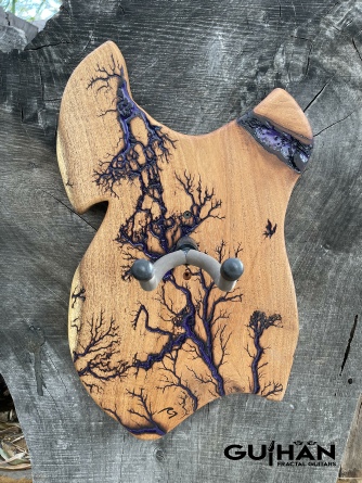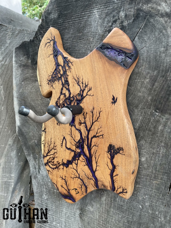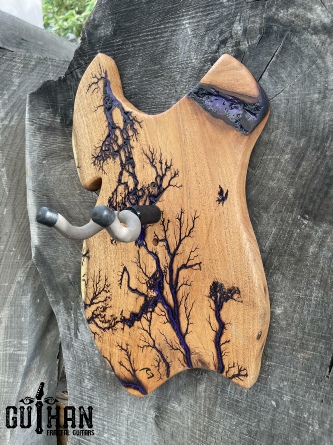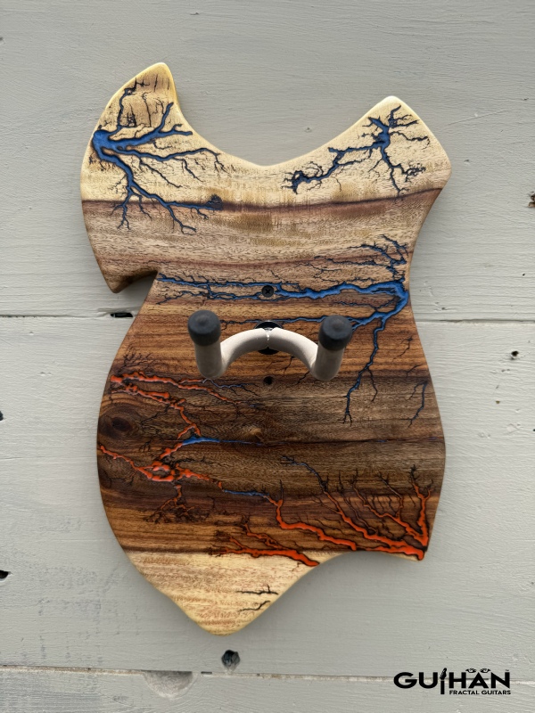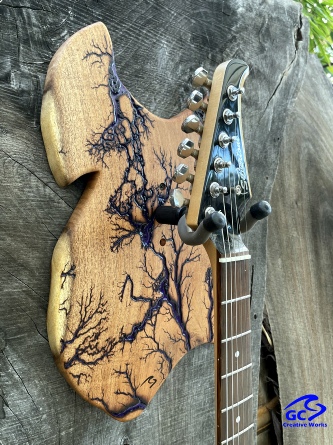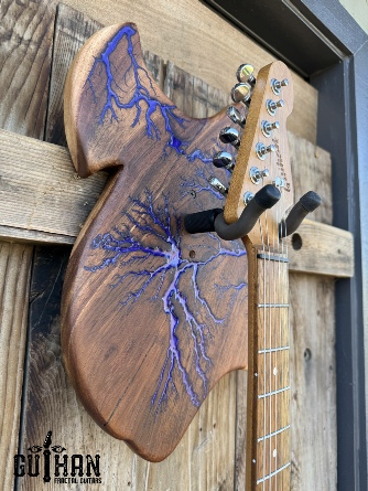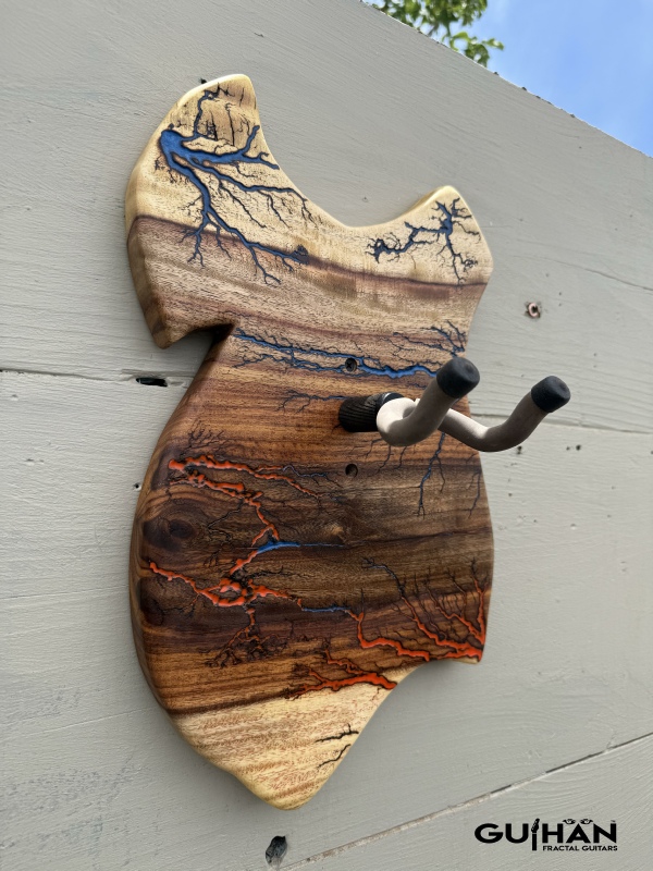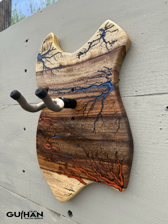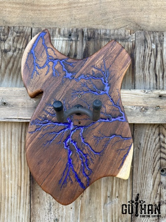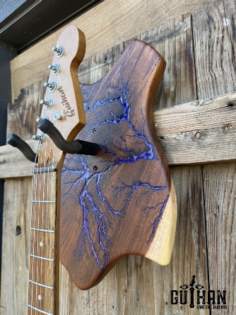 ►DESIGN: This is an inspired guitar hanger custom hand-crafted features a fractal art design. This creative art is a tribute to a person who has been a profound influence on my musical life since childhood. It stands as a symbol of my gratitude for his immense talent and lasting impact on the world of music. ►DISCLAIMER: GC Creative Works/Guihan Guitars is not affiliated with, or endorsed, sponsored, or supported by any professional musician artists. The name and picture are merely for descriptive purposes only. The guitar in the picture is not included. It is solely used for descriptive visual purposes only. ►WOOD: Arizona grown desert hardwood is uniquely hand-crafted and custom designed from weathered-down trees found in metropolitan Phoenix areas. By recovering the logs, allows me to create a 100% sustainable guitar hanger. Note* Since the fractal art is uniquely done to each wood, the picture shown above is not the exact fractal design you'll receive. The shape and size will be the same. ►FRACTAL ART: A process of applying 20,000 volts of electricity to the wood surface recreating a lightning strike in slow motion as well as unique abstract figures, tree and vein like shapes. It is sealed with epoxy inlay ink self-leveling high gloss U.V. resistant formula. ►EPOXY: Self-leveling high gloss U.V. A resistant formula epoxy with color pigment is added to seal the burns created during fractal art process on the surface of the wood. The colors available are: (Angel White, Aqua Marine, Arizona Gold, Army Green, Black, Blue Metallic, Cardinal Metallic, Caribbean Blue, Desert Copper, Emerald Metallic, Golden Yellow, Gray Metallic, Hot Pink, Hunter Green, Orange Crush, Pearl White, Purple Metallic, Red Metallic, Silver Grey, Teal Metallic, Turquoise Blue. Other colors available upon request.) ►OIL FINISH: Hand rubbed Old Masters clear satin gel polyurethane and food grade oils to bring out the natural beauty of wooden surfaces. ►STRING SWING HARDWARE: The new design, known as the “Guitar Keeper”, has a deep cradle design that prevents the guitar from being improperly placed into the hanger. This ultimately provides a safer hanger for your instrument, as the guitar needs to be lifted 2 inches and brought forward to be removed. The pivoting yoke allows for Electric, Acoustic or Bass guitar headstocks to be cradled perfectly while still hanging straight. Made in the USA. ►DESIGN ENGINEERING: Garie Chavez has researched and tested the use of proper hardware for mounting the String Swing guitar hanger to live edge wood materials. A threaded insert made of carbon steel zinc plated finish goes into a pre pre-drilled hole and has internal threads. It offers a strong permanent thread to live edge hardwood and mount the guitar hanger yoke. Mounting hardware included with two drywall anchors and two 2-inch Phillips wood screws. ►MOUNTING INSTRUCTIONS: To mount on existing stud walls, drive the screws through pre-drilled pilot holes of the hanger into the wall using a Phillips screwdriver. If a wall stud is not found, mark the pilot holes on the guitar hanger using a Phillips screwdriver to push and turn the aluminum wall anchor clockwise until flush. Mount the guitar hanger with screws provided through the pilot holes and secure into drywall anchors. GC Creative Works is not responsible for any damages to the musical instrument for any improper installation of the guitar hanger to the wall.It is the sole responsibility of the owner/buyer to properly install the guitar hanger to the wall. ►►DONATION: PRN Alumni Foundation, officially formed in 2017, is comprised of former employees of Paisley Park and the international icon Prince. The group’s mission is to continue the generosity of their late boss who supported opportunities for underprivileged youth to grow in music, tech, arts and education, and helped alumni members in-need. Thank you for your support. ►PAYMENT TERMS: PAYPAL secure shopping cart is used on this website for online purchases. ►DIMENSIONS: Height: 15-16 inches Width: 8-10 inches Thickness: 1-1-1/4 inch ►SHIPPING TERMS: Free to continental US states including Alaska, Hawaii and Puerto Rico. Standard Shipping takes 3 to 7 business days from the date of order received. Additional freight charges for International shipments. ►COMPLETION TIME: Please allow 3-7 days to complete from the time order is received. ►ARTIST / MUSICIAN / LUTHIER: Garie Chavez - I have been designing live edge wood art since 2015 and building custom handmade electric guitars since 2023. Patience, persistence, passion and attention to detail are the key ingredients to my work. My goal is for my clients to have a unique piece of art that they cherish, and know that it is truly one of a kind and made especially for them. Thank you for having my art in your home.