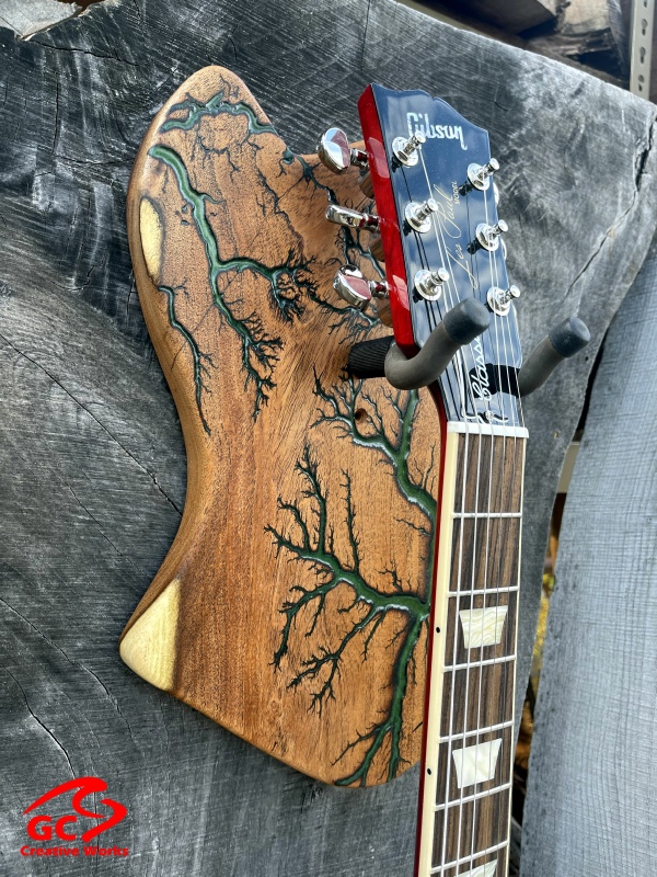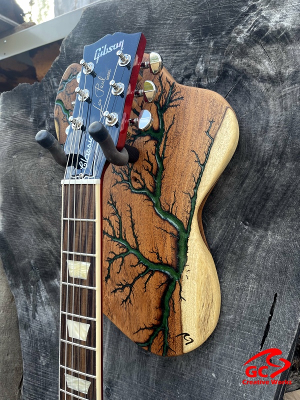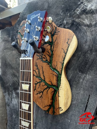 ►INSPIRATION: The creative design behind each guitar hanger is based on the musicians I’ve come to admire throughout my lifetime that made an impact and inspired me to play guitar. It’s my token of appreciation for creating great music of my generation. Keep ROCKING the world! ►DISCLAIMER: GC Creative Works is not affiliated with, or endorsed, sponsored, or supported by any professional musician artists. The names and images are merely for descriptive purposes only. ►DONATION: GC Creative Works donate part of the guitar hanger sale to MusiCares. A non-profit organization that helps the humans behind music because music gives so much to the world. Thank you for your support. ►LIVEEDGEWOOD: Each live edge guitar hanger is uniquely hand-crafted and custom designed from weathered-down trees found around metropolitan Phoenix, Arizona. By acquiring these logs, it allows me to create 100% sustainable, re-purposed live edge wood art designs. Locally source and made in North Peoria, Arizona. ►FRACTALART: A process of applying 20,000 volts of electricity to the wood surface recreating a lightning strike in slow motion as well as unique abstract figures, tree and vein like shapes. It is sealed with epoxy inlay ink self-leveling high gloss U.V. resistant formula. ►EPOXYCOLORS: Angel White, Aqua Marine, Arizona Gold, Army Green, Black, Blue Metallic, Cardinal Metallic, Caribbean Blue, Desert Copper, Emerald Metallic, Golden Yellow, Gray Metallic, Hot Pink, Hunter Green, Neon Green, Orange Crush, Pearl White, Purple Metallic, Red Metallic, Silver Grey, Teal Metallic, Turquoise Blue. Other colors available upon request. ►OILFINISH: Hand rubbed Old Masters clear satin gel polyurethane and food grade oils to bring out the natural beauty of wooden surfaces. ►GUITARHARDWARE: The new design, known as the “Guitar Keeper”, has a deep cradle design that prevents the guitar from being improperly placed into the hanger. This ultimately provides a safer hanger for your instrument, as the guitar needs to be lifted 2 inches and brought forward to be removed. The pivoting yoke allows for Electric, Acoustic or Bass guitar headstocks to be cradled perfectly while still hanging straight. Made in the USA. ►ENGINEERING: GC Creative Works researched and tested the use of proper hardware for mounting the String Swing guitar hanger to live edge wood materials. A threaded insert made of carbon steel zinc plated finished goes into predrilled hole and has internal threads. It offers a strong permanent thread to live edge hardwood and mount the guitar hanger yoke. Mounting hardware included with two drywall anchors and two 2-inch Phillips wood screws. ►MOUNTING INSTRUCTIONS: To mount on existing stud walls, drive the screws through pre-drilled pilot holes of hanger into wall using a Phillips screwdriver. If a wall stud is not found, mark the pilot holes on the guitar hanger using a Phillips screwdriver to push and turn the aluminum wall anchor clockwise until flush. Mount the guitar hanger with screws provided through the pilot holes and secure into drywall anchors. GC Creative Works is not responsible for any damages to the musical instrument for any improper installation of the guitar hanger to the wall.It is the sole responsibility of the owner/buyer to properly install the guitar hanger to the wall. ►DIMENSIONS: Height: 15-16 inches Width: 8-10 inches Thickness: 1-1-1/4 inch ►COMPLETIONTIMELINE: Please allow 3-7 days to complete from the time order is received.