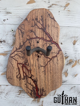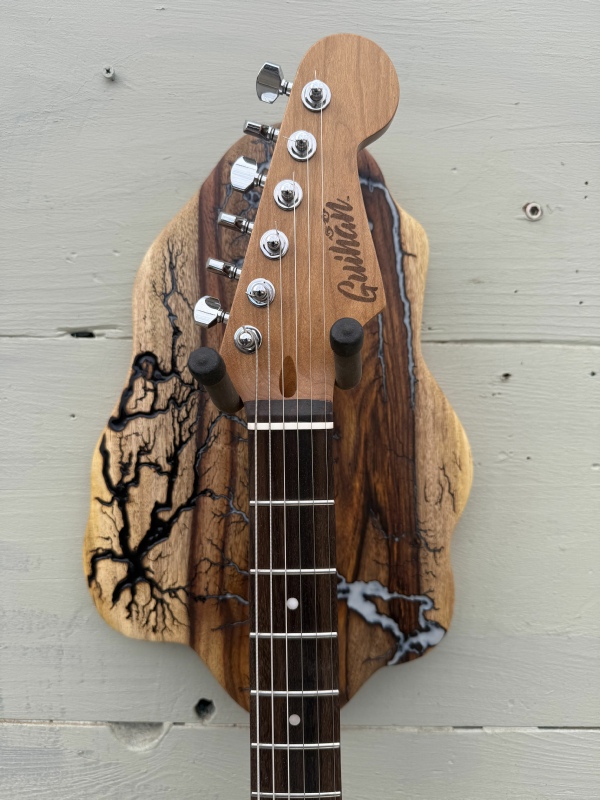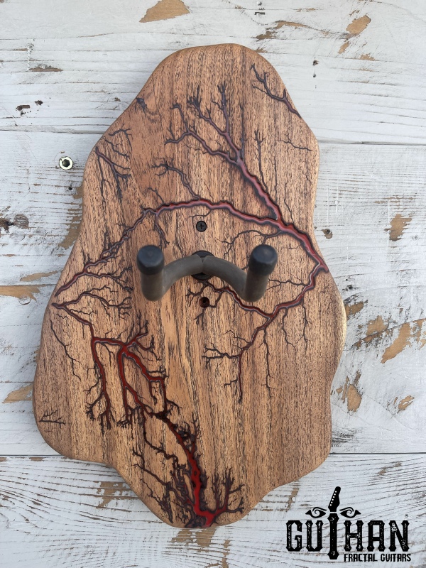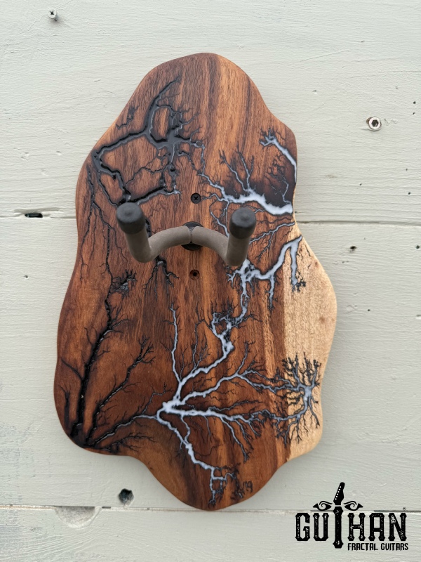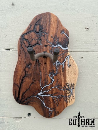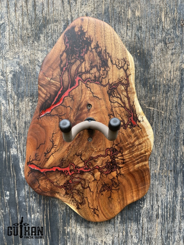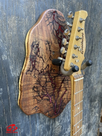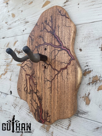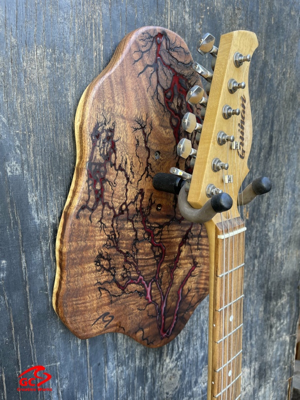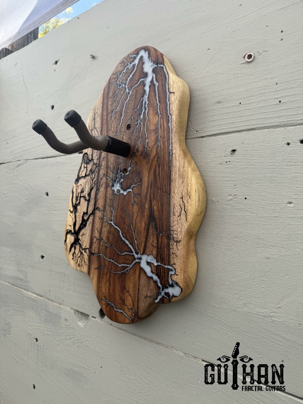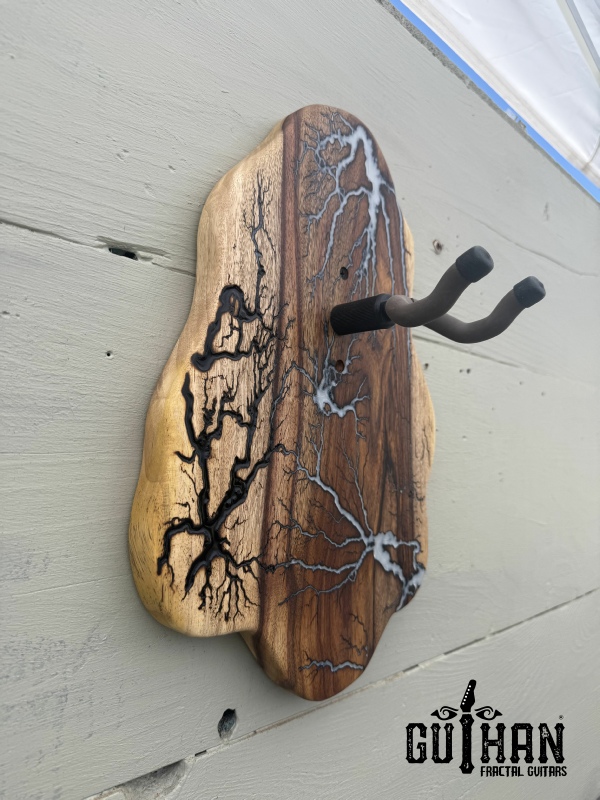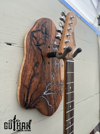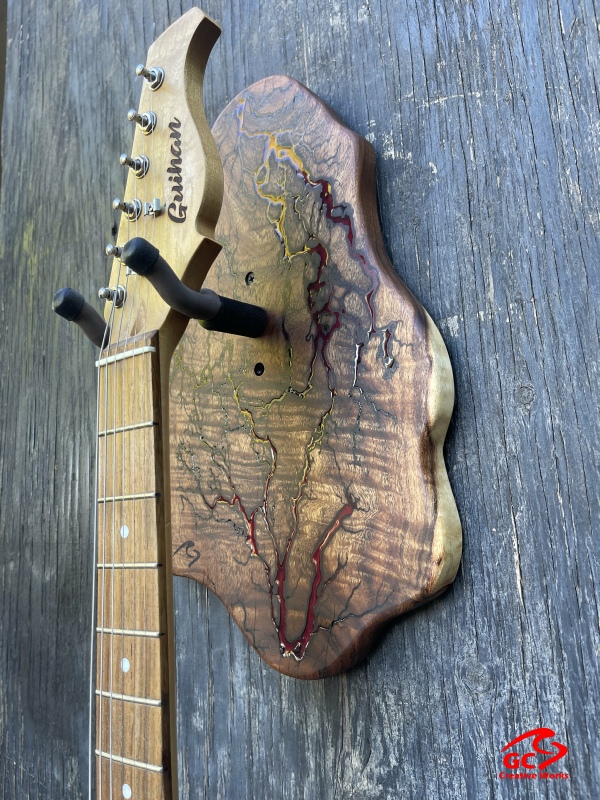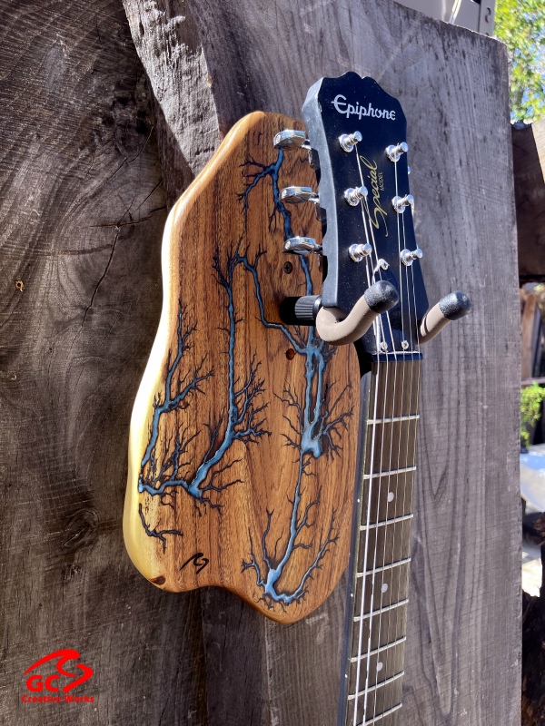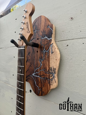►DESIGN: This is an inspired guitar hanger custom hand-crafted features a fractal art design. This creative art is a tribute to a person who has been a profound influence on my musical life since childhood. It stands as a symbol of my gratitude for his immense talent and lasting impact on the world of music. ►DISCLAIMER: GC Creative Works/Guihan Guitars is not affiliated with, or endorsed, sponsored, or supported by any professional musician artists. The name and picture are merely for descriptive purposes only. The guitar in the picture is not included. It is solely used for descriptive visual purposes only. ►WOOD: Arizona grown desert hardwood is uniquely hand-crafted and custom designed from weathered-down trees found in metropolitan Phoenix areas. By recovering the logs, allows me to create a 100% sustainable guitar hanger. Note* Since the fractal art is uniquely done to each wood, the picture shown above is not the exact fractal design you'll receive. The shape and size will be the same. ►FRACTAL ART: A process of applying 20,000 volts of electricity to the wood surface recreating a lightning strike in slow motion as well as unique abstract figures, tree and vein like shapes. It is sealed with epoxy inlay ink self-leveling high gloss U.V. resistant formula. ►EPOXY: Self-leveling high gloss U.V. A resistant formula epoxy with color pigment is added to seal the burns created during fractal art process on the surface of the wood. The colors available are: (Angel White, Aqua Marine, Arizona Gold, Army Green, Black, Blue Metallic, Cardinal Metallic, Caribbean Blue, Desert Copper, Emerald Metallic, Golden Yellow, Gray Metallic, Hot Pink, Hunter Green, Orange Crush, Pearl White, Purple Metallic, Red Metallic, Silver Grey, Teal Metallic, Turquoise Blue. Other colors available upon request.) ►OIL FINISH: Hand rubbed Old Masters clear satin gel polyurethane and food grade oils to bring out the natural beauty of wooden surfaces. ►STRING SWING HARDWARE: The new design, known as the “Guitar Keeper”, has a deep cradle design that prevents the guitar from being improperly placed into the hanger. This ultimately provides a safer hanger for your instrument, as the guitar needs to be lifted 2 inches and brought forward to be removed. The pivoting yoke allows for Electric, Acoustic or Bass guitar headstocks to be cradled perfectly while still hanging straight. Made in the USA. ►DESIGN ENGINEERING: Garie Chavez has researched and tested the use of proper hardware for mounting the String Swing guitar hanger to live edge wood materials. A threaded insert made of carbon steel zinc plated finish goes into a pre pre-drilled hole and has internal threads. It offers a strong permanent thread to live edge hardwood and mount the guitar hanger yoke. Mounting hardware included with two drywall anchors and two 2-inch Phillips wood screws. ►MOUNTING INSTRUCTIONS: To mount on existing stud walls, drive the screws through pre-drilled pilot holes of the hanger into the wall using a Phillips screwdriver. If a wall stud is not found, mark the pilot holes on the guitar hanger using a Phillips screwdriver to push and turn the aluminum wall anchor clockwise until flush. Mount the guitar hanger with screws provided through the pilot holes and secure into drywall anchors. GC Creative Works is not responsible for any damages to the musical instrument for any improper installation of the guitar hanger to the wall.It is the sole responsibility of the owner/buyer to properly install the guitar hanger to the wall. ►DONATION: GC Creative Works donate part of the sales of guitar hanger fractal art to Sweet Relief Musicians Fund. A 501-C3 non profit charity that provides services and financial assistance for all types of career musicians and music industry professionals. Thank you for your support. ►PAYMENT TERMS: PAYPAL secure shopping cart is used on this website for online purchases. ►DIMENSIONS: Height: 15-16 inches Width: 8-10 inches Thickness: 1-1-1/4 inch ►SHIPPING TERMS: Free to continental US states including Alaska, Hawaii and Puerto Rico. Standard Shipping takes 3 to 7 business days from the date of order received. Additional freight charges for International shipments. ►COMPLETION TIME: Please allow 3-7 days to complete from the time order is received.