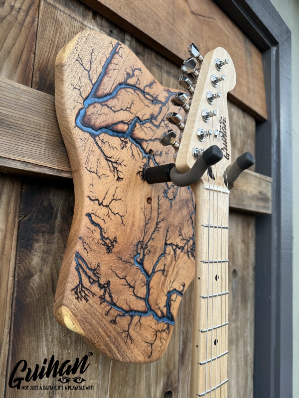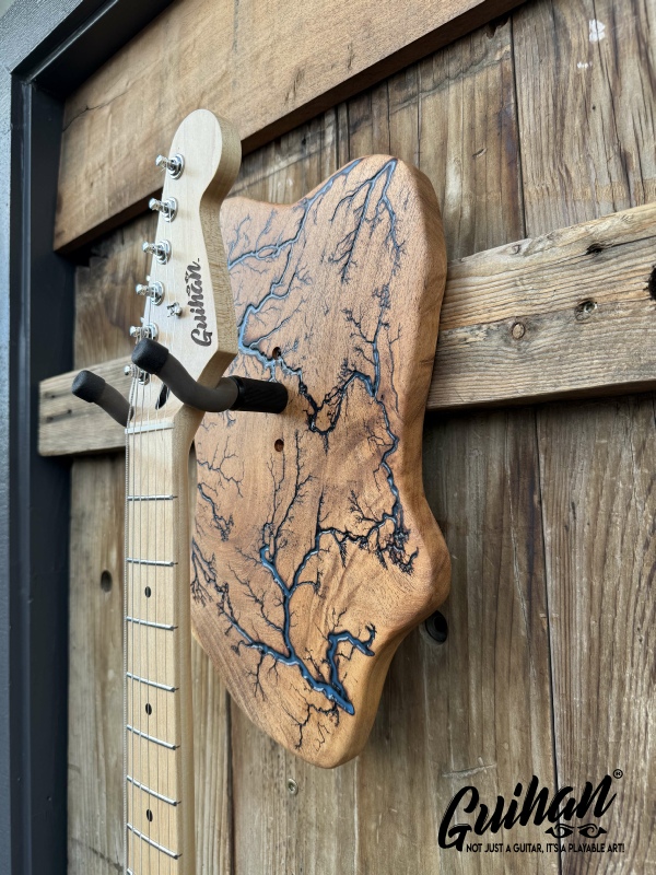 ►DESIGN: This is an inspired guitar hanger custom hand-crafted features a fractal art design. This creative art is a tribute to a person who has been a profound influence on my musical life since childhood. It stands as a symbol of my gratitude for his immense talent and lasting impact on the world of music. ►DISCLAIMER: GC Creative Works/Guihan Guitars is not affiliated with, or endorsed, sponsored, or supported by any professional musician artists. The name and picture are merely for descriptive purposes only. The guitar in the picture is not included. It is solely used for descriptive visual purposes only. ►WOOD: Arizona grown desert hardwood is uniquely hand-crafted and custom designed from weathered-down trees found in metropolitan Phoenix areas. By recovering the logs, allows me to create a 100% sustainable guitar hanger. Note* Since the fractal art is uniquely done to each wood, the picture shown above is not the exact fractal design you'll receive. The shape and size will be the same. ►FRACTAL ART: A process of applying 20,000 volts of electricity to the wood surface recreating a lightning strike in slow motion as well as unique abstract figures, tree and vein like shapes. It is sealed with epoxy inlay ink self-leveling high gloss U.V. resistant formula. ►EPOXY: Self-leveling high gloss U.V. A resistant formula epoxy with color pigment is added to seal the burns created during fractal art process on the surface of the wood. The colors available are: (Angel White, Aqua Marine, Arizona Gold, Army Green, Black, Blue Metallic, Cardinal Metallic, Caribbean Blue, Desert Copper, Emerald Metallic, Golden Yellow, Gray Metallic, Hot Pink, Hunter Green, Orange Crush, Pearl White, Purple Metallic, Red Metallic, Silver Grey, Teal Metallic, Turquoise Blue. Other colors available upon request.) ►OIL FINISH: Hand rubbed Old Masters clear satin gel polyurethane and food grade oils to bring out the natural beauty of wooden surfaces. ►STRING SWING HARDWARE: The new design, known as the “Guitar Keeper”, has a deep cradle design that prevents the guitar from being improperly placed into the hanger. This ultimately provides a safer hanger for your instrument, as the guitar needs to be lifted 2 inches and brought forward to be removed. The pivoting yoke allows for Electric, Acoustic or Bass guitar headstocks to be cradled perfectly while still hanging straight. Made in the USA. ►DESIGN ENGINEERING: Garie Chavez has researched and tested the use of proper hardware for mounting the String Swing guitar hanger to live edge wood materials. A threaded insert made of carbon steel zinc plated finish goes into a pre pre-drilled hole and has internal threads. It offers a strong permanent thread to live edge hardwood and mount the guitar hanger yoke. Mounting hardware included with two drywall anchors and two 2-inch Phillips wood screws. ►MOUNTING INSTRUCTIONS: To mount on existing stud walls, drive the screws through pre-drilled pilot holes of the hanger into the wall using a Phillips screwdriver. If a wall stud is not found, mark the pilot holes on the guitar hanger using a Phillips screwdriver to push and turn the aluminum wall anchor clockwise until flush. Mount the guitar hanger with screws provided through the pilot holes and secure into drywall anchors. GC Creative Works is not responsible for any damages to the musical instrument for any improper installation of the guitar hanger to the wall.It is the sole responsibility of the owner/buyer to properly install the guitar hanger to the wall. ►DONATION: GC Creative Works donate part of the sales of guitar hanger fractal art to Sweet Relief Musicians Fund. A 501-C3 non profit charity that provides services and financial assistance for all types of career musicians and music industry professionals. Thank you for your support. ►PAYMENT TERMS: PAYPAL secure shopping cart is used on this website for online purchases. ►DIMENSIONS: Height: 15-16 inches Width: 8-10 inches Thickness: 1-1-1/4 inch ►SHIPPING TERMS: Free to continental US states including Alaska, Hawaii and Puerto Rico. Standard Shipping takes 3 to 7 business days from the date of order received. Additional freight charges for International shipments. ►COMPLETION TIME: Please allow 3-7 days to complete from the time order is received.