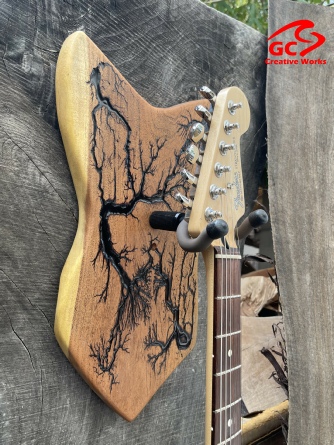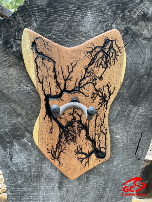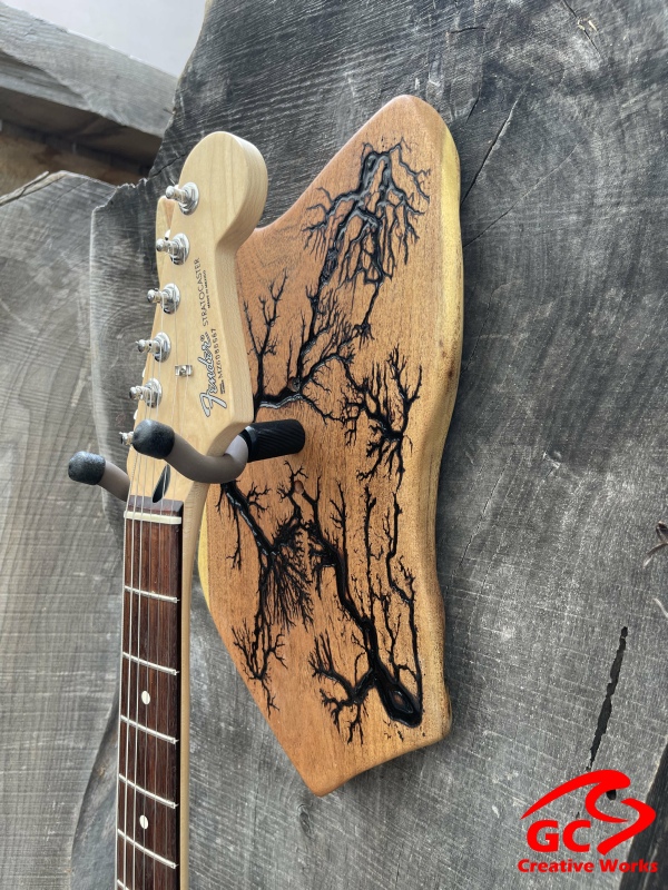 ►INSPIRATION: The creative design behind each guitar hanger is based on the musicians I’ve come to admire throughout my lifetime that made an impact and inspired me to play guitar. It’s my token of appreciation for creating great music of my generation. Keep ROCKING the world! ►DISCLAIMER: GC Creative Works is not affiliated with, or endorsed, sponsored, or supported by any professional musician artists. The names and images are merely for descriptive purposes only. ►DONATION: GC Creative Works donate part of the guitar hanger sale to MusiCares. A non-profit organization that helps the humans behind music because music gives so much to the world. Thank you for your support. ►LIVEEDGEWOOD: Each live edge guitar hanger is uniquely hand-crafted and custom designed from weathered-down trees found around metropolitan Phoenix, Arizona. By acquiring these logs, it allows me to create 100% sustainable, re-purposed live edge wood art designs. Locally source and made in North Peoria, Arizona. ►FRACTALART: A process of applying 20,000 volts of electricity to the wood surface recreating a lightning strike in slow motion as well as unique abstract figures, tree and vein like shapes. It is sealed with epoxy inlay ink self-leveling high gloss U.V. resistant formula. ►EPOXYCOLORS: Angel White, Aqua Marine, Arizona Gold, Army Green, Black, Blue Metallic, Cardinal Metallic, Caribbean Blue, Desert Copper, Emerald Metallic, Golden Yellow, Gray Metallic, Hot Pink, Hunter Green, Neon Green, Orange Crush, Pearl White, Purple Metallic, Red Metallic, Silver Grey, Teal Metallic, Turquoise Blue. Other colors available upon request. ►OILFINISH: Hand rubbed Old Masters clear satin gel polyurethane and food grade oils to bring out the natural beauty of wooden surfaces. ►GUITARHARDWARE: The new design, known as the “Guitar Keeper”, has a deep cradle design that prevents the guitar from being improperly placed into the hanger. This ultimately provides a safer hanger for your instrument, as the guitar needs to be lifted 2 inches and brought forward to be removed. The pivoting yoke allows for Electric, Acoustic or Bass guitar headstocks to be cradled perfectly while still hanging straight. Made in the USA. ►ENGINEERING: GC Creative Works researched and tested the use of proper hardware for mounting the String Swing guitar hanger to live edge wood materials. A threaded insert made of carbon steel zinc plated finished goes into predrilled hole and has internal threads. It offers a strong permanent thread to live edge hardwood and mount the guitar hanger yoke. Mounting hardware included with two drywall anchors and two 2-inch Phillips wood screws. ►MOUNTING INSTRUCTIONS: To mount on existing stud walls, drive the screws through pre-drilled pilot holes of hanger into wall using a Phillips screwdriver. If a wall stud is not found, mark the pilot holes on the guitar hanger using a Phillips screwdriver to push and turn the aluminum wall anchor clockwise until flush. Mount the guitar hanger with screws provided through the pilot holes and secure into drywall anchors. GC Creative Works is not responsible for any damages to the musical instrument for any improper installation of the guitar hanger to the wall.It is the sole responsibility of the owner/buyer to properly install the guitar hanger to the wall. ►DIMENSIONS: Height: 15-16 inches Width: 8-10 inches Thickness: 1-1-1/4 inch ►COMPLETIONTIMELINE: Please allow 3-7 days to complete from the time order is received.