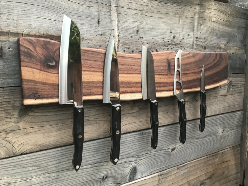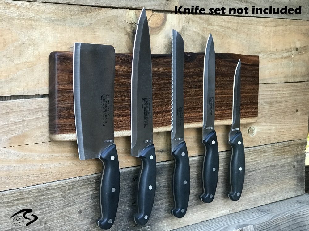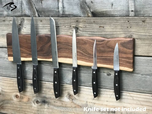 ►DISCLAIMER: PLEASE read the description below prior to purchasing this item. Each live edge wood is unique and vary from log to log milled. The pictures are solely to show the different grain patterns and shade characteristics of the wood. Every item is custom made to order which means no two live edge wood will ever be the same or what you see in the sample pictures listed. If you have further questions, please call or email. ►KNIFE HOLDER DESCRIPTION: Live edge Arizona grown desert hardwood magnetic knife holder wall mount has multiple Neodymium super strong magnets routed depth evenly, embedded in the back of the wood and sealed with epoxy. The magnets are evenly spaced for each knife. Wall mounted design frees up counter and drawer space and gives a creative look in your home. Designed for wall or back splash mounting. The back is routed at each end for keyhole. Two brass metal keyholes are attached on the back of the wood for added strength. Mounting instructions, wall anchors and screws included. NOTE**** The KNIVES are not included in the picture shown. It is only for illustration purposes. You are only purchasing the live edge magnetic knife holder. ►WOOD MATERIAL: Arizona grown BLACK ACACIA desert hardwood is uniquely hand-crafted and custom designed from weathered-down trees found in the suburban metropolitan Phoenix area. By acquiring desert hardwood logs allows me to create 100% sustainable, repurposed live edge wood designs. This prevents some logs from being taken to the landfill. Both sides of live edge slab goes to a router sled table to obtain desired flat surface and thickness. Note that each wood material has a has a unique characteristic and will vary in shape, size, texture and it's not always what's in the picture shown. During the build process, I fill most of the natural cracks with epoxy. The cracks on the wood may be visible due to its natural air drying process and kiln dry process. As the wood slab ages, noticeable cracks on the wood may appear due to its natural dry cracking process and changes in humidity and temperature. Any voids or cracks from the wood are sealed with epoxy to maintain the integrity of the wood. ►NEODYMIUM MAGNET: Neodymium magnets are the strongest permanent magnets. They provide unparalleled levels of magnetism and resistance to demagnetization. They are also described as rare-earth magnets, because neodymium is part of the rare-earth family of elements. ►OIL FINISH: Hand rubbed finish using OLD MASTERS gel polyurethane clear satin gel and food grade oils . It brings out the natural beauty of wooden surfaces; durable coating for use on wood surfaces and contains ultraviolet absorbers for advanced sun protection. ►DIMENSIONS: Length: 18 inches Width: 5 inches Thickness: vary from 3/4-1-1/8 inch ►COMPLETION TIMELINE: Please allow 5-7 days to complete each cross from the time order is received. ►PLACEMENT OF KNIVES: To prevent the live edge wood magnetic holder from getting scarred, turn the knife handle 90 degrees and pull straight out. To put knife in place, hold it straight and rest the back of the knife on the wood and turn to secure in place. Click here to see video on You Tube.