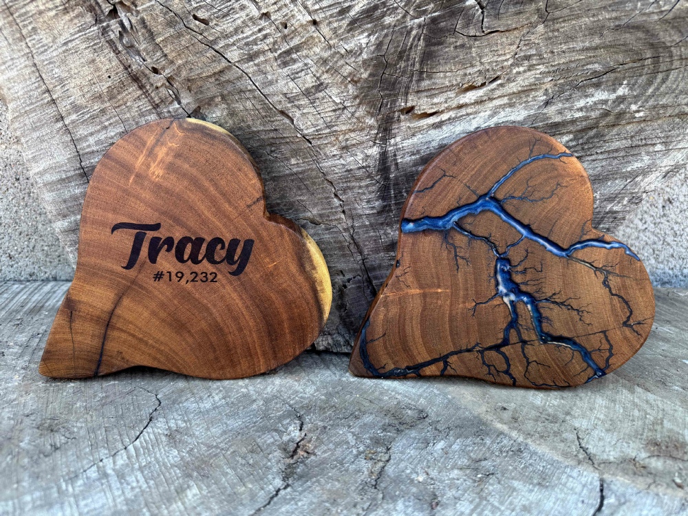 A process of applying 20,000 volts of electricity on the surface of the wood with conductive solution and recreating a lightning strike in slow motion as well as unique abstract figures, tree and veinlike shapes. The fractal art design on the heart represents the beautiful life and memories of Tracy.
